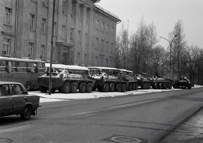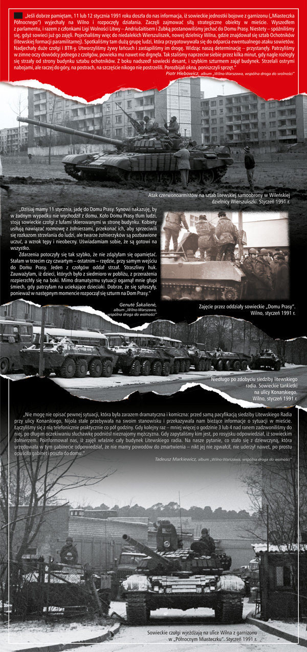 Jeśli dobrze pamiętam, 11 lub 12 stycznia 1991 roku doszła do nas informacja, iż sowieckie jednostki bojowe z garnizonu („Miasteczka Północnego”) wyjechały na Wilno i rozpoczęły działania. Zaczęli zajmować siłą strategiczne obiekty w mieście. Wyszedłem z parlamentu i razem z członkami Ligi Wolności Litwy – Andriušaitisem i Zubką, postanowiliśmy jechać do Domu Prasy. Niestety – spóźniliśmy się, gdyż Sowieci już go zajęli. Pojechaliśmy więc do niedalekich Wierszuliszek, nowej dzielnicy Wilna, gdzie znajdował się sztab Ochotników (litewskiej formacji paramilitarnej). Spotkaliśmy tam dużą grupę ludzi, która przygotowywała się do odparcia ewentualnego ataku Sowietów. Nadjechały duże czołgi i BTR-y. Utworzyliśmy żywy łańcuch i zastąpiliśmy im drogę. Widząc naszą determinację – przystanęły. Patrzyliśmy w zimne oczy dowódcy jednego z czołgów, powieka mu nawet nie drgnęła. Tak staliśmy naprzeciw siebie przez kilka minut, gdy nagle rozległy się strzały od strony budynku sztabu Ochotników. Z boku nadszedł sowiecki desant i szybkim szturmem zajął budynek. Strzelali ostrymi nabojami, ale raczej do góry, na postrach, na szczęście nikogo nie postrzelili. Porozbijali okna, poniszczyli sprzęt.