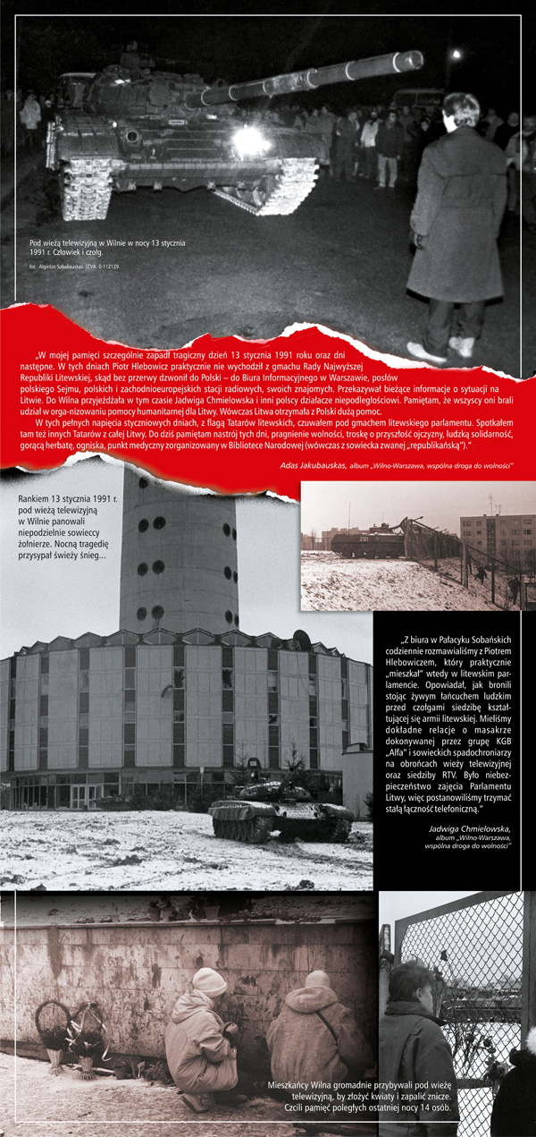 Z biura w pałacyku Sobańskich codziennie rozmawialiśmy z Piotrem Hlebowiczem, który praktycznie „mieszkał” wtedy w litewskim parlamencie. Opowiadał, jak bronili, stojąc żywym łańcuchem ludzkim przed czołgami, siedzibę kształtującej się armii litewskiej. Mieliśmy dokładne relacje o masakrze dokonywanej przez grupę KGB „Alfa” i sowieckich spadochroniarzy na obrońcach Wieży Telewizyjnej oraz siedziby RTV. Było niebezpieczeństwo zajęcia parlamentu Litwy, więc postanowiliśmy trzymać stałą łączność telefoniczną.
