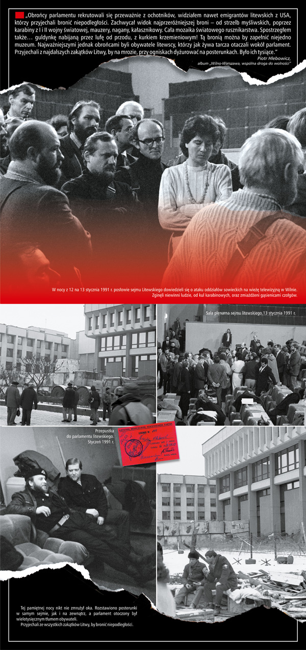 Obrońcy parlamentu rekrutowali się przeważnie z ochotników, widziałem nawet emigrantów litewskich z USA, którzy przyjechali bronić niepodległości. Zachwycał widok najprzeróżniejszej broni – od strzelb myśliwskich, poprzez karabiny z I i II wojny światowej, mauzery, nagany, kałasznikowy. Cała mozaika światowego rusznikarstwa. Spostrzegłem także… guldynkę nabijaną przez lufę od przodu, z kurkiem krzemieniowym! Tą bronią można by zapełnić niejedno muzeum. Najważniejszymi jednak obrońcami byli obywatele litewscy, którzy jak żywa tarcza otaczali wokół parlament. Przyjechali z najdalszych zakątków Litwy, by na mrozie, przy ogniskach, dyżurować na posterunkach. Były ich tysiące.
