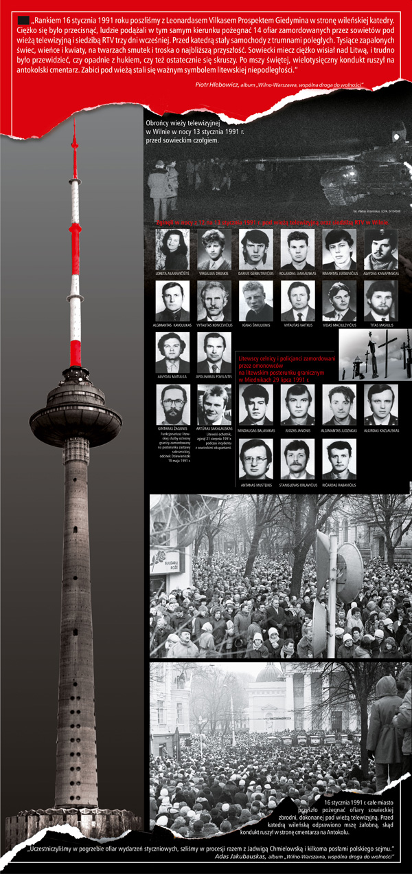 Rankiem 16 stycznia 1991 roku poszliśmy z Leonardasem Vilkasem Prospektem Giedymina w stronę wileńskiej katedry. Ciężko się było przecisnąć, ludzie podążali w tym samym kierunku, pożegnać 14 ofiar zamordowanych przez Sowietów pod Wieżą Telewizyjną i siedzibą RTV trzy dni wcześniej. Przed katedrą stały samochody z trumnami poległych. Tysiące zapalonych świec, wieńce i kwiaty, na twarzach smutek i troska o najbliższą przyszłość. Sowiecki miecz ciężko wisiał nad Litwą i trudno było przewidzieć, czy opadnie z hukiem, czy też ostatecznie się skruszy. Po mszy świętej wielotysięczny kondukt ruszył na antokolski cmentarz. Zabici pod Wieżą stali się ważnym symbolem litewskiej niepodległości.