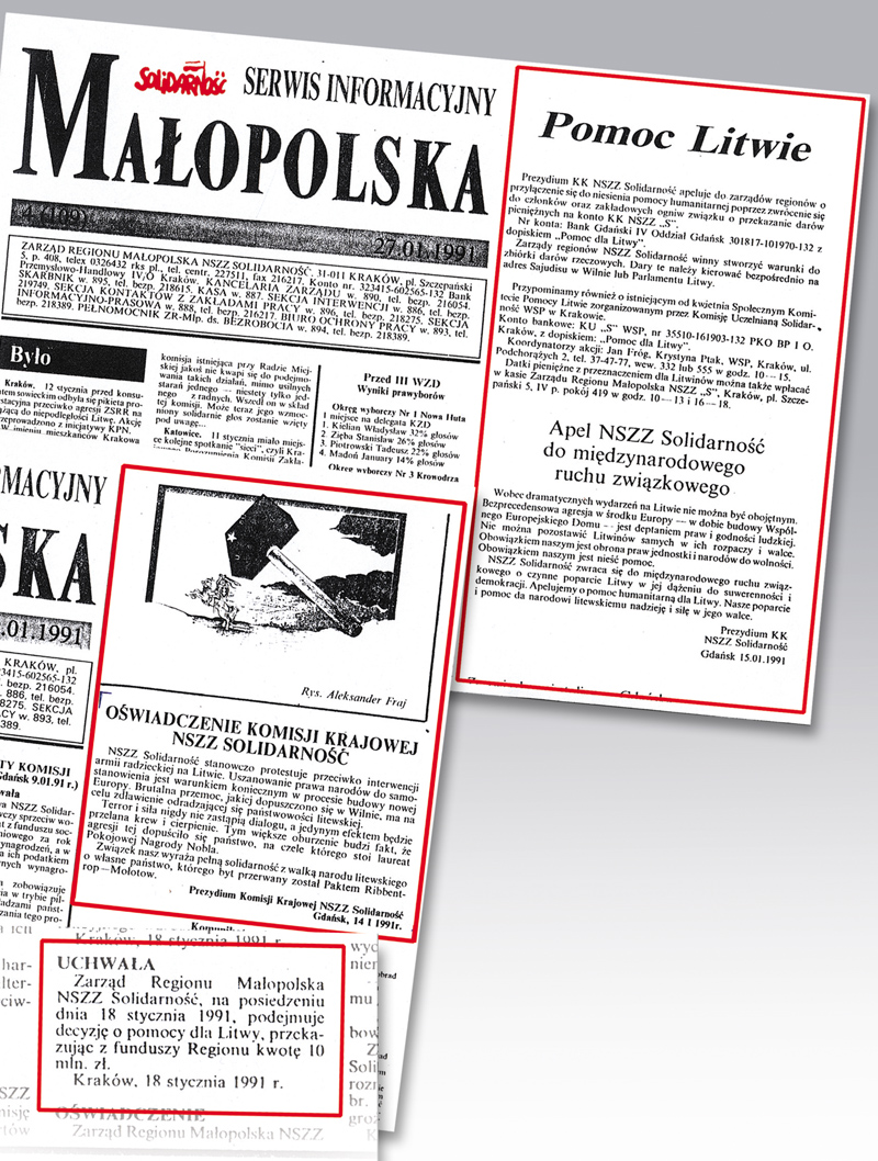 14 stycznia, po sowieckiej akcji pod Wieżą TV i pod siedzibą radia i TV, Komisja Krajowa NSZZ „Solidarność” wydała ostre oświadczenie potępiające akcje armii sowieckiej na Litwie, a w dniu następnym (15 stycznia 1991 roku) zaapelowano do zarządów regionów NSZZ „Solidarność” w całej Polsce o pomoc dla Litwy. Po zebraniu medykamentów, odzieży i innych rzeczy transporty wyruszyły do Wilna. Cała Polska była z narodem litewskim. Niestety, ówczesna sytuacja przerosła władze odrodzonej RP. A był to właściwy moment, by uznać Republikę Litewską jako podmiot prawa międzynarodowego i powiedzieć stanowcze „nie!” sowieckiej okupacji.