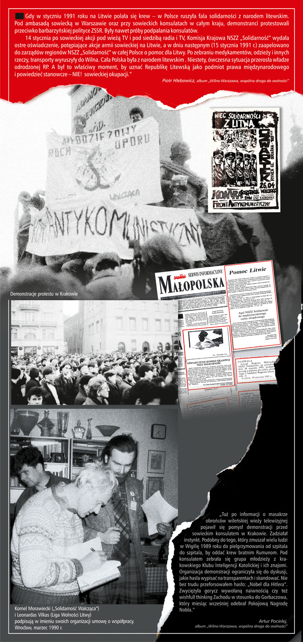 Gdy w styczniu 1991 roku na Litwie polała się krew, w Polsce ruszyła fala solidarności z narodem litewskim. Pod ambasadą sowiecką w Warszawie oraz przy sowieckich konsulatach w całym kraju demonstranci protestowali przeciwko barbarzyńskiej polityce ZSRS. Były nawet próby podpalania konsulatów.