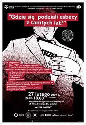 27 lutego 2007 r. w auli Wydziału Filologiczno-Historycznego Uniwersytetu Gdańskiego odbyło się kolejne, zorganizowane przez gdański oddział IPN oraz Kulturalny Kolektyw UG, spotkanie z cyklu „Tak wygląda nasz świat”, którego tematykę zawarto w tytule: „Gdzie się podziali esbecy z tamtych lat”. Punktem wyjścia do rozmowy był pokaz filmu „Psy” (1992 r.) w reżyserii Władysława Pasikowskiego. Film został poprzedzony prelekcją dr. Krzysztofa Kornackiego, filmoznawcy z UG, który zaprezentował nie tylko artystyczne czy warsztatowe zalety obrazu, ale przede wszystkim podkreślił jego wartość jako źródła historycznego, oddającego klimat wydarzeń i nastrojów w Polsce początku lat dziewięćdziesiątych. Po projekcji odbyła się dyskusja, w której udział wzięli licznie przybyli studenci, dziennikarze oraz pracownicy IPN: dr Sławomir Cenckiewicz, dr Igor Hałagida i dr Piotr Semków. Historycy wskazywali na pewne nieścisłości pojawiające się w filmie, wynikające jednak – jak się wydaje – z potrzeb scenariusza i konieczności zachowania tempa akcji, oraz odpowiadali na pytania dotyczące m.in. wizerunku funkcjonariuszy SB w masowej wyobraźni, różnych dróg życiowych byłych esbeków po 1989 r., problemu niszczenia akt, stopnia ich zachowania i dostępności oraz zagadnień związanych z lustracją.