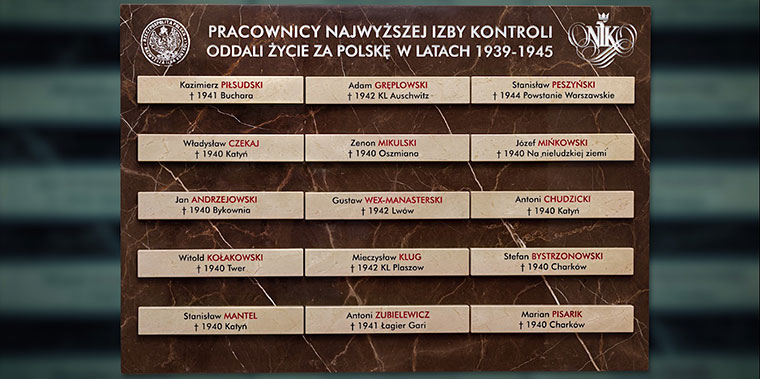 Ściana Pamięci NIK przypomina m.in. o Kazimierzu Piłsudskim, młodszym bracie Naczelnika Państwa Józefa Piłsudskiego, który dekretem z 7 lutego 1919 r. utworzył Najwyższą Izbę Kontroli Państwa. Kazimierz Piłsudski, radca prezesa NIK, aresztowany przez NKWD, przeszedł przez moskiewskie więzienia Butyrki i Łubianka. Zwolniony na podstawie umowy Sikorski – Majski (1941) nie miał już sił, by planować powrót. Zmarł w Bucharze.