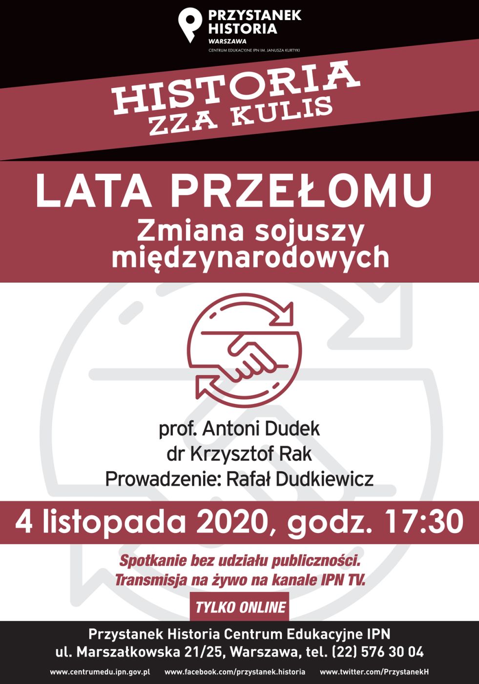 4 listopada 2020 roku, w Centrum Edukacyjnym IPN im. Janusza Kurtyki „Przystanek Historia” w Warszawie, odbyła się dyskusja online Lata przełomu. Zmiana sojuszy międzynarodowych z cyklu Historia zza kulis. Gośćmi Rafała Dudkiewicza byli prof. Antoni Dudek oraz dr Krzysztof Rak.