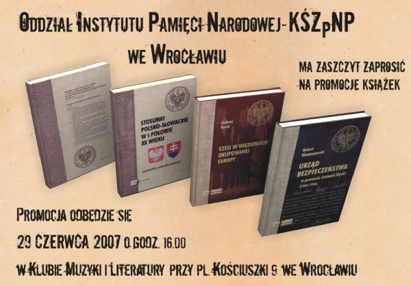 29 czerwca odbyła się promocja książek wydanych w ramach wrocławskiej serii wydawniczej IPN. Spotkanie miało miejsce w Klubie Muzyki i Literatury przy ul. Kościuszki 9 we Wrocławiu. Zaprezentowane zostały ostatnio wydane książki: