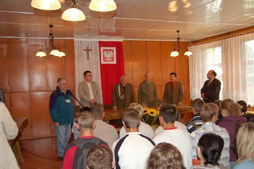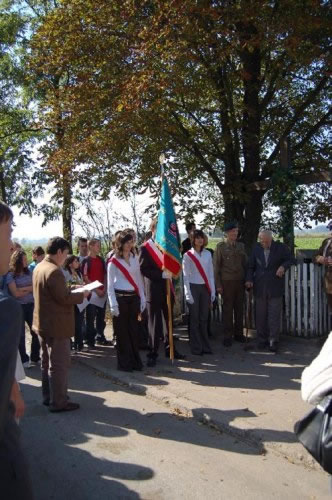 Fot. 2. Kalnica, wstęp wygłasza Andrzej Muczyński, od lewej stoją kolejno: PiotrŁapiński, ks. dziekan Roman Wodyński, kpt. Henryk Bańkowski – prezes ŚZŻAK ObwódBielsk Podlaski, Zbigniew Romaniuk – nauczyciel historii, Krzysztof Jaworowski –wójt gminy Brańsk