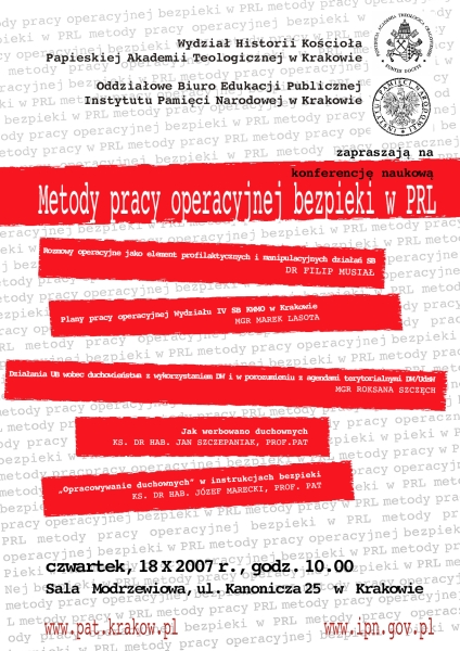 18 października 2007 r., odbyła się konferencja naukowa „Metody pracy operacyjnej bezpieki w PRL”, zorganizowana przez Oddział Instytutu Pamięci Narodowej w Krakowie i Wydział Historii Kościoła Papieskiej Akademii Teologicznej w Krakowie. Konferencja wpisała się w cykl spotkań i sesji, organizowanych przez krakowskie Biuro Edukacji Publicznej, które mają na celu przybliżenie metod działania komunistycznego aparatu represji na ziemiach polskich.
