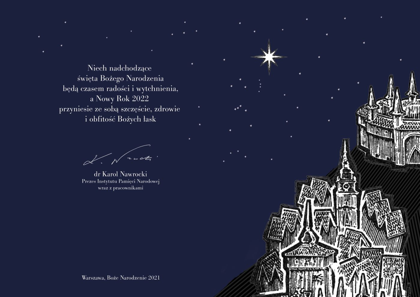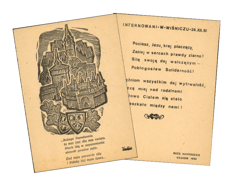 Do kartki załączono tekst napisany przez internowanych w stanie wojennym do melodii kolędy „Bóg się rodzi”