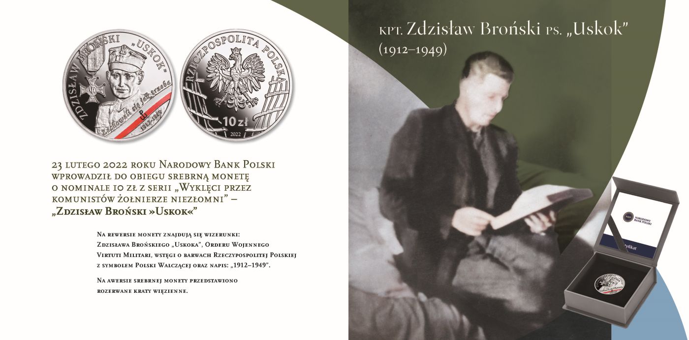28 lutego 2022 w Centrum Pieniądza NBP im. Sławomira S. Skrzypka w Warszawie zaprezentowano kolejną srebrną monetę (o nominale 10 PLN), którą uhonorowany został bohater podziemia – Zdzisław Broński ps. Uskok, podoficer WP, członek Polskiej Organizacji Zbrojnej i Armii Krajowej, dowódca oddziału partyzanckiego AK, a następnie Zrzeszenia Wolność i Niezawisłość (WIN) na Lubelszczyźnie. Na rewersie monety znajdują się wizerunki: Zdzisława Brońskiego, Orderu Wojennego Virtuti Militari, wstęgi w barwach Rzeczypospolitej Polskiej z symbolem Polski Walczącej oraz napis: 1912–1949. Na awersie przedstawiono rozerwane kraty więzienne.