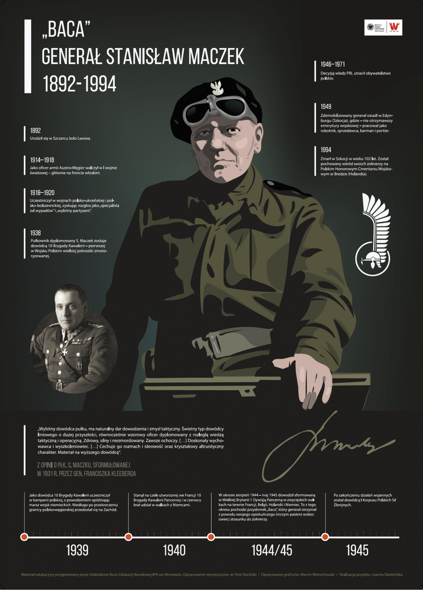 Gen. Stanisław Maczek trwale zapisał się na kartach historii Polski. Z wykształcenia filozof, miłośnik literatury ojczystej, poświęcił się służbie wojskowej, stając się ojcem polskiej broni pancernej. Głośno było o nim już podczas walk o niepodległość i granice Polski po zakończeniu I wojny światowej. Sławę przyniósł mu jednak udział w II wojnie światowej – w kampanii wrześniowej 1939 r. dowodził pierwszą wielką zmotoryzowaną jednostką Wojska Polskiego – 10. Brygadą Kawalerii, następnie w walkach na terenie Francji w 1940 r. – 10. Brygadą Kawalerii Pancernej, od lutego 1942 r. – 1. Dywizją Pancerną, która uczestniczyła w końcowych działaniach operacji „Overlord”, a po zwycięskiej bitwie pod Falaise w wyzwalaniu Belgii i Holandii. O popularności generała zadecydował nie tylko jego talent dowódczy, lecz także dbałość o żołnierzy, nieszafowanie ich życiem. Zyskał też sympatię mieszkańców wyzwalanych terenów, którzy doceniali zarówno fakt oswobodzenia, jak i to, że dzięki jego umiejętnościom taktycznym ich miasta nie zostały zniszczone. Po wojnie dzielił los żołnierzy polskich na emigracji. Przez władze komunistyczne został pozbawiony obywatelstwa polskiego.