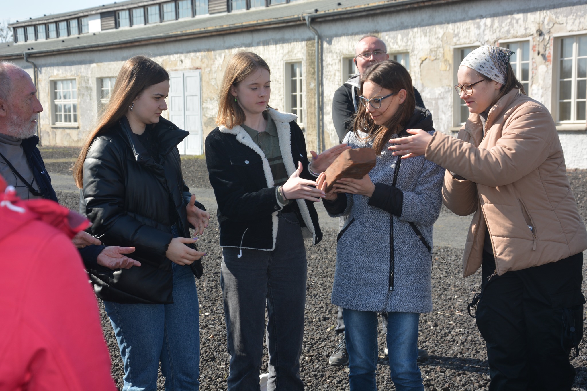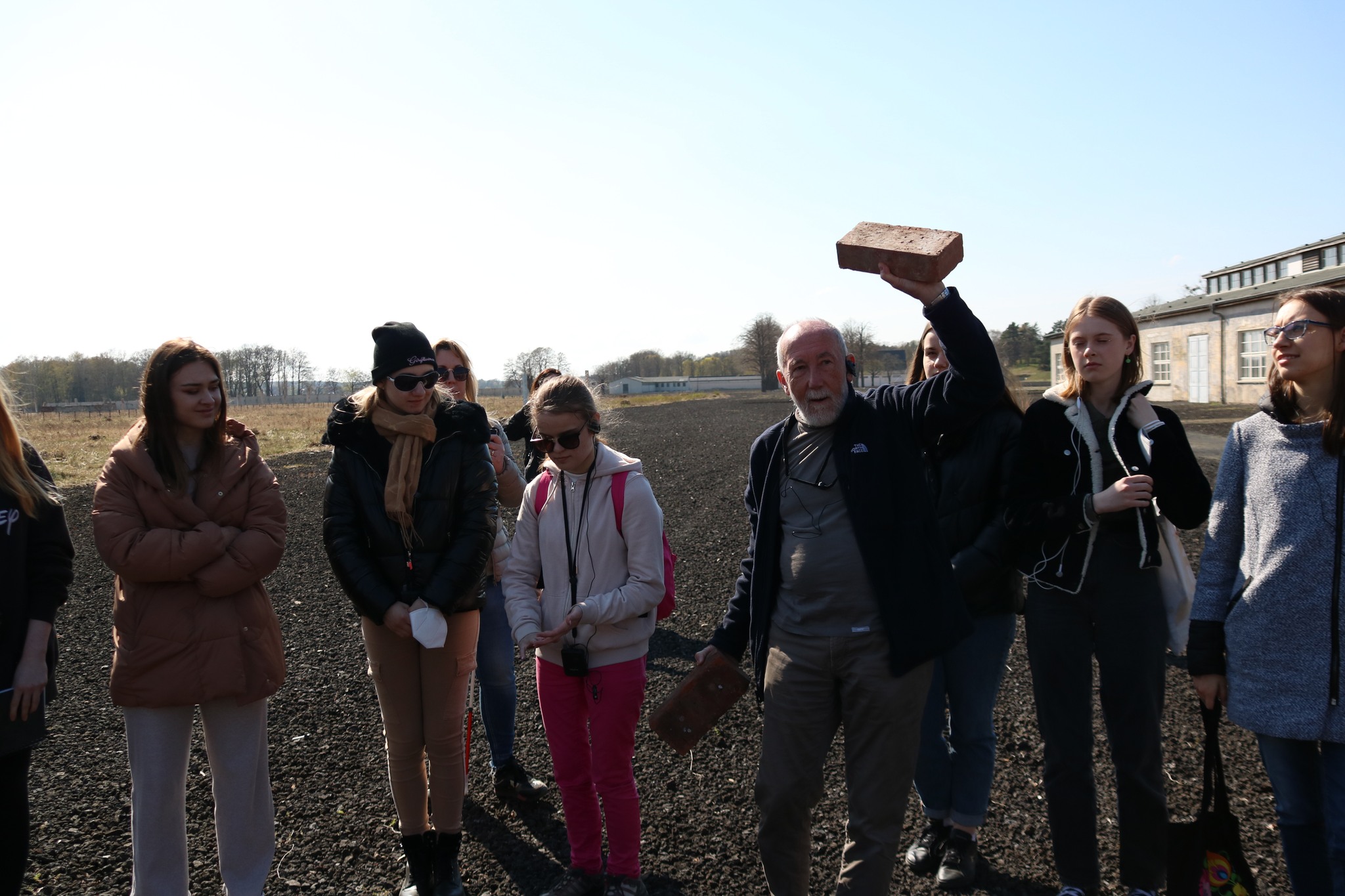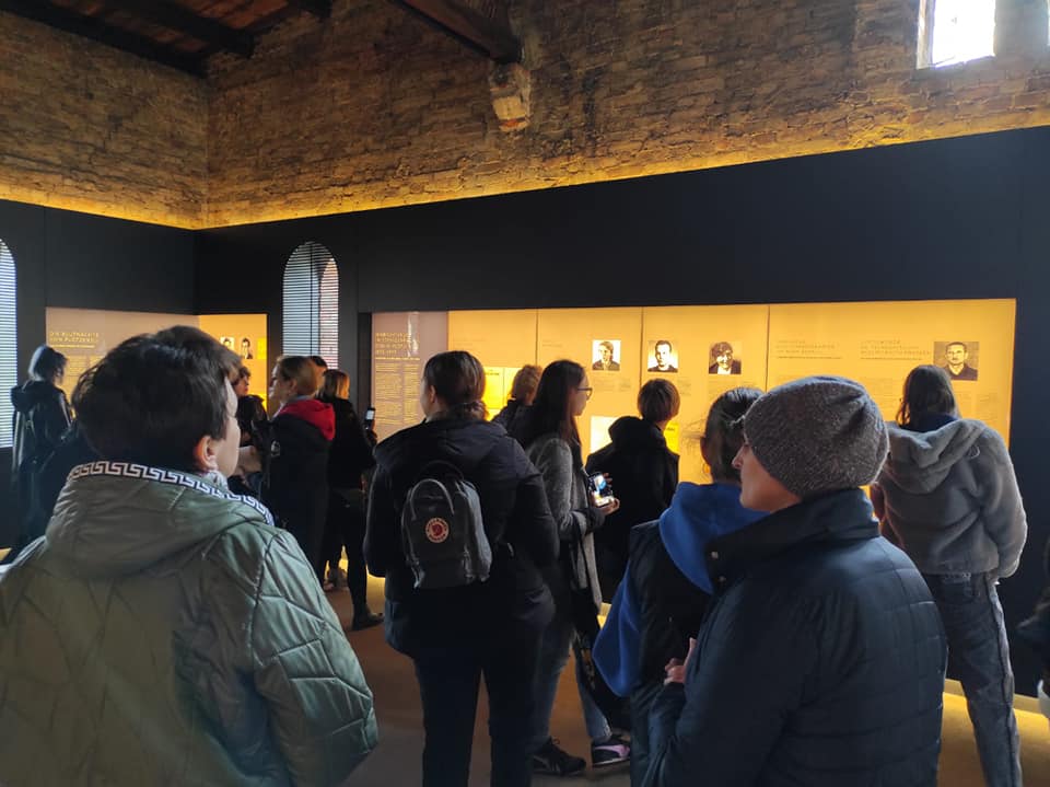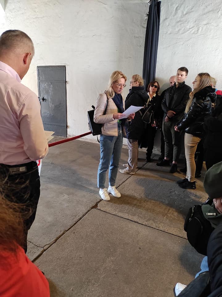 Najważniejszy dzień naszego wyjazdu edukacyjnego to ten, gdy możemy przejść przez teren obozu. Zaczęliśmy od domu, w którym mieszkali komendanci wraz z rodzinami, a następnie przeszliśmy do punktu na wzniesieni, skąd rozprzestrzenia się widok na cały obszar KL Ravensbrück i okolicę. Kolejnym etapem naszego zwiedzania był budynek Komendantury, w którym obejrzeliśmy wystawę stałą przedstawiającą historię obozu, eksponaty związane z więźniarkami, ich prace plastyczne, rękodzieło, rysunki, wiersze oraz sabotażyki – miniaturowe rzeźby. Wśród artefaktów znajdują się także tabliczki szamotowe, przekazane do Muzeum, a odnalezione podczas ekshumacji prowadzonych przez IPN na cmentarzu w Fürstenbergu w 2019 r. Na tabliczkach znalezionych przy urnach są wybite nazwiska, imiona i daty śmierci straconych. Po zwiedzaniu Muzeum przyszedł czas na przekroczenie obozowej bramy. Pod przewodnictwem Eweliny Małachowskiej, Marii Lorens, Michała Nuemanna oraz Pawła Woźniaka poznaliśmy historię powstawania i rozmieszczenia obozowych zabudowań, okoliczności towarzyszących przybyciu zugangów (nowych więźniarek), odbywaniu kwarantanny, konspiracyjnego nauczania w czasie wielogodzinnych apeli czy pracy w przyobozowych szwalniach. Dzięki wspomnieniom „ze źródła”, czyli wprost od dzieci byłych więźniarek, mogliśmy dowiedzieć się o konspiracyjnych lekcjach geografii czy o monotonii pracy w szwalni. Najbardziej przejmujące były jednak opowieści o pseudomedycznych eksperymentach, przeprowadzanych w większości na młodych polskich więźniarkach. Samym operacjom kostnym i mięśniowym poddano 86 więźniarek, w tym 74 Polki, przy czym wiele z tych, które przeżyły, do końca swych dni dczuwało ból fizyczny z powodu okaleczeń.