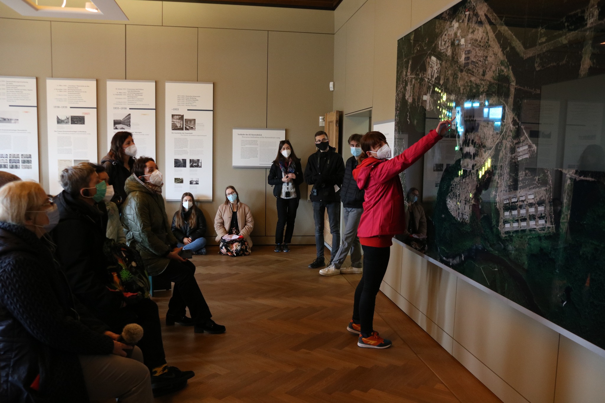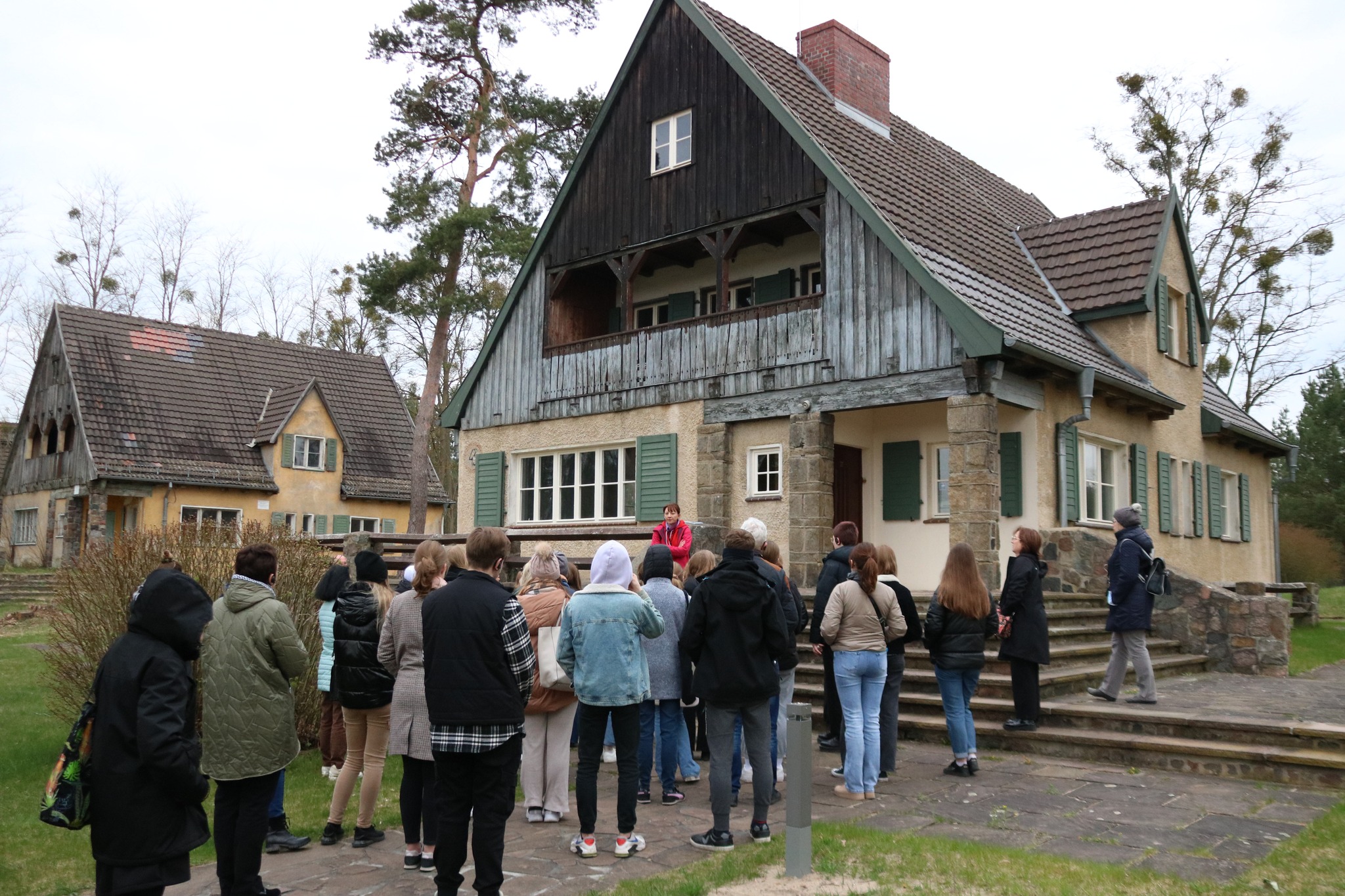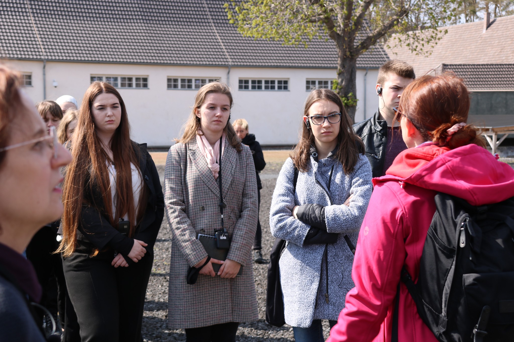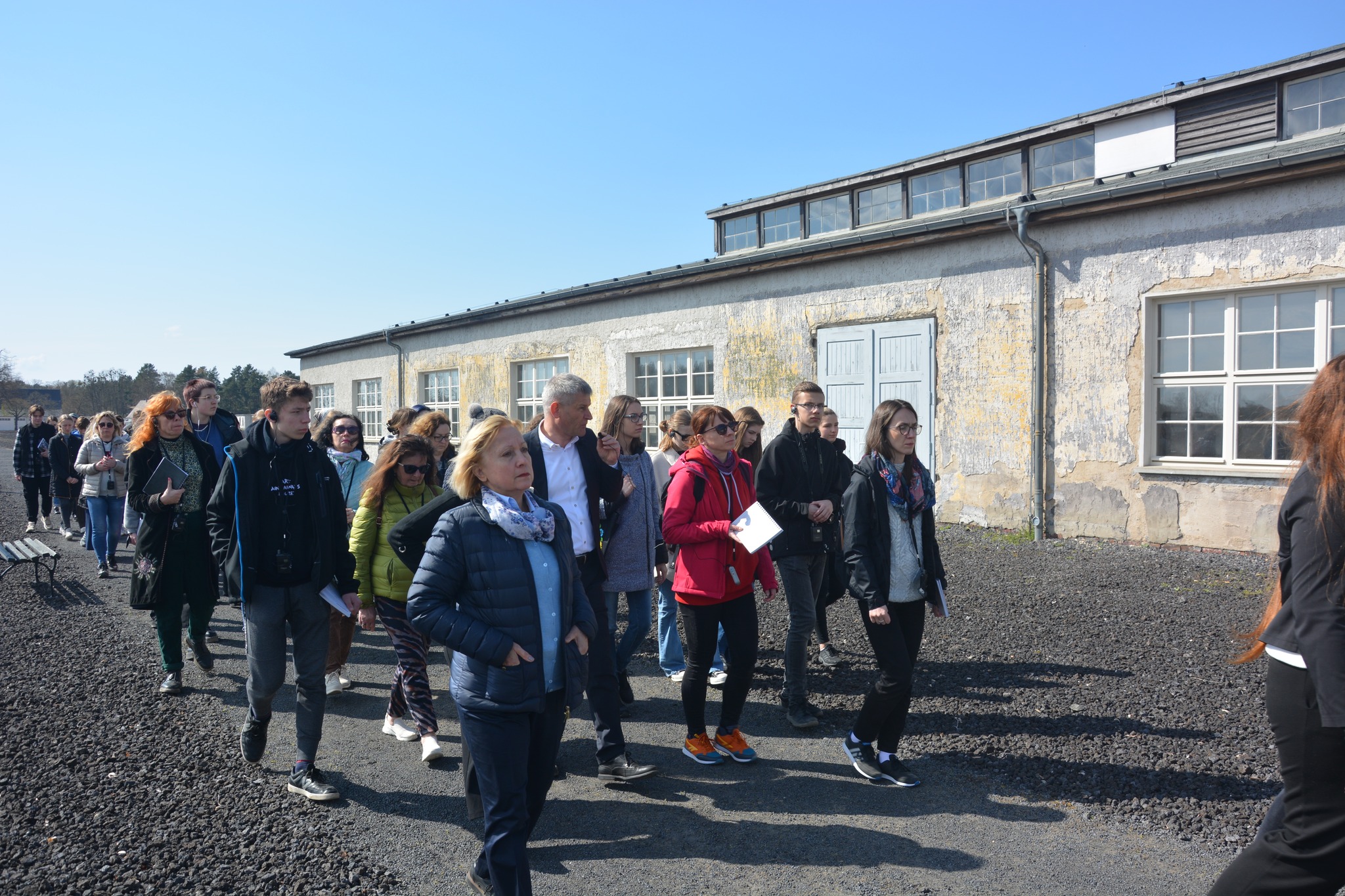 Najważniejszy dzień naszego wyjazdu edukacyjnego to ten, gdy możemy przejść przez teren obozu. Zaczęliśmy od domu, w którym mieszkali komendanci wraz z rodzinami, a następnie przeszliśmy do punktu na wzniesieni, skąd rozprzestrzenia się widok na cały obszar KL Ravensbrück i okolicę. Kolejnym etapem naszego zwiedzania był budynek Komendantury, w którym obejrzeliśmy wystawę stałą przedstawiającą historię obozu, eksponaty związane z więźniarkami, ich prace plastyczne, rękodzieło, rysunki, wiersze oraz sabotażyki – miniaturowe rzeźby. Wśród artefaktów znajdują się także tabliczki szamotowe, przekazane do Muzeum, a odnalezione podczas ekshumacji prowadzonych przez IPN na cmentarzu w Fürstenbergu w 2019 r. Na tabliczkach znalezionych przy urnach są wybite nazwiska, imiona i daty śmierci straconych. Po zwiedzaniu Muzeum przyszedł czas na przekroczenie obozowej bramy. Pod przewodnictwem Eweliny Małachowskiej, Marii Lorens, Michała Nuemanna oraz Pawła Woźniaka poznaliśmy historię powstawania i rozmieszczenia obozowych zabudowań, okoliczności towarzyszących przybyciu zugangów (nowych więźniarek), odbywaniu kwarantanny, konspiracyjnego nauczania w czasie wielogodzinnych apeli czy pracy w przyobozowych szwalniach. Dzięki wspomnieniom „ze źródła”, czyli wprost od dzieci byłych więźniarek, mogliśmy dowiedzieć się o konspiracyjnych lekcjach geografii czy o monotonii pracy w szwalni. Najbardziej przejmujące były jednak opowieści o pseudomedycznych eksperymentach, przeprowadzanych w większości na młodych polskich więźniarkach. Samym operacjom kostnym i mięśniowym poddano 86 więźniarek, w tym 74 Polki, przy czym wiele z tych, które przeżyły, do końca swych dni dczuwało ból fizyczny z powodu okaleczeń.