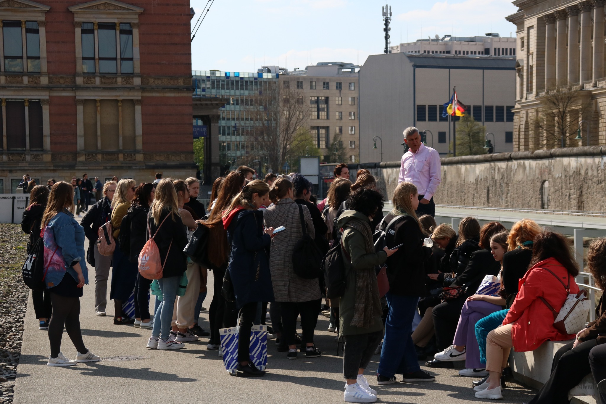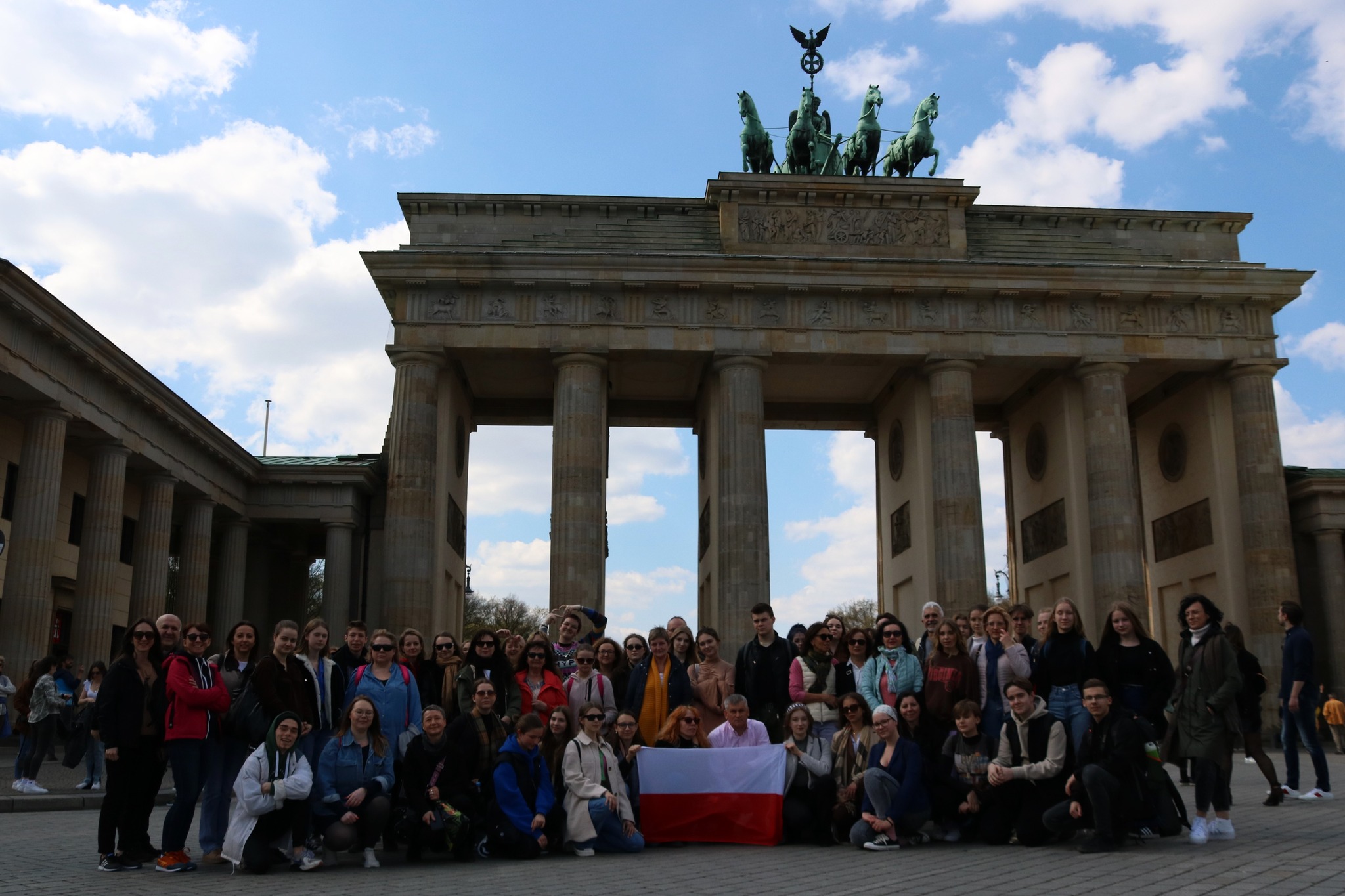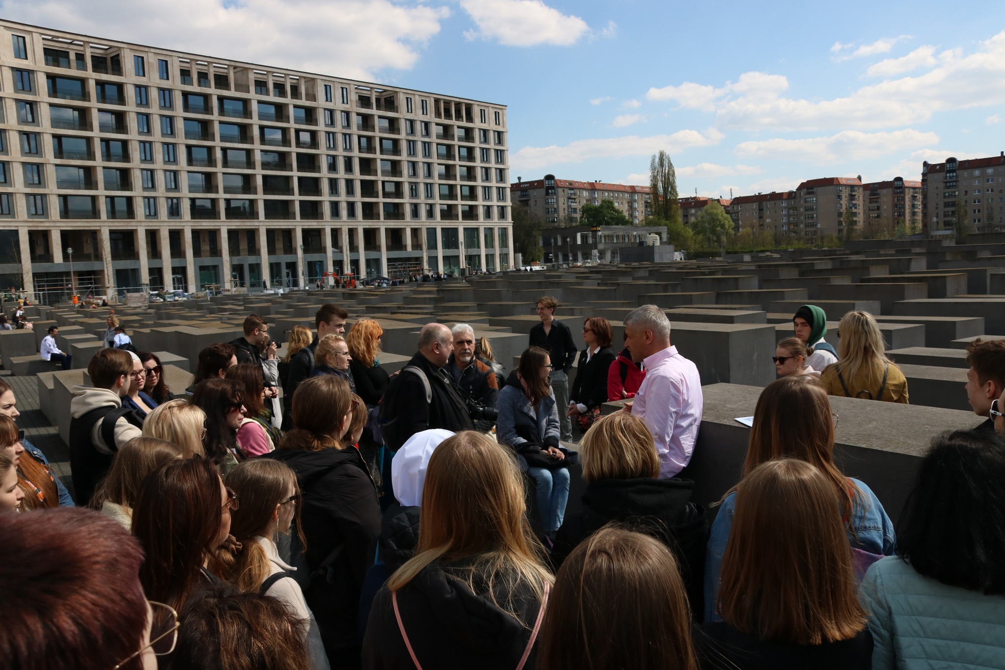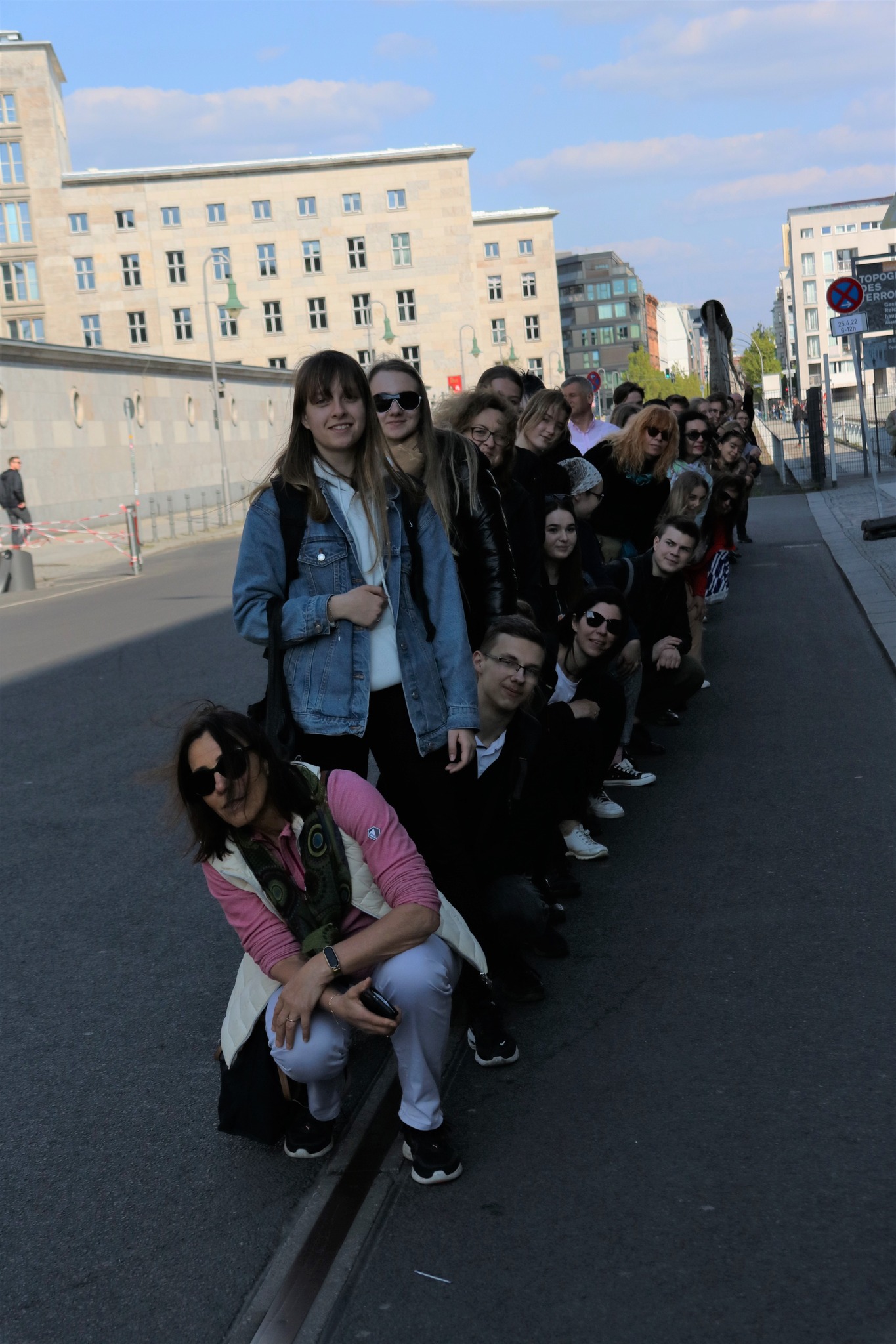 Nasz przewodnik Paweł Woźniak poprowadził nas dalej ulicami Berlina, odkrywając przed nami kolejne nieoczywiste historie związane z miastem. W parku przed gmachem parlamentu (Reichstag) posłuchaliśmy o dziejach tego miejsca: budynek zbudowany został na ziemiach należących niegdyś do hrabiego Atanazego Raczyńskiego, polskiego ziemianina. Następnie przeszliśmy przez Bramę Brandenburską, gdzie nie mogło zabraknąć wspólnego zdjęcia. Potem dotarliśmy do pomnika Pomordowanych Żydów Europy. Na zakończenie pobytu w Berlinie zwiedziliśmy jeszcze ruiny dawnej siedziby Gestapo, gdzie przetrzymywany i torturowany był m.in. gen. Stefan Rowecki „Grot” – komendant główny Armii Krajowej. Dziś stanową one część Muzeum Topografii Terroru. W tym samym miejscu znajdują się także pozostałości po murze berlińskim – symbolu zimnej wojny, dzielącym Berlin i całe Niemcy przez prawie 30 lat. Na zakończenie dnia, po powrocie do Ravensbrück, tradycyjnie spotkaliśmy się pod Totengangiem gdzie odmówiliśmy wspólną modlitwę. Wysłuchaliśmy też tekstów więźniarki – Urszuli Wińskiej, a Jakub Słowik, finalista konkursu, przeczytał nigdy niepublikowany wiersz autorstwa Marii Rutkowskiej-Kurcyusz pt. „Zachód”.