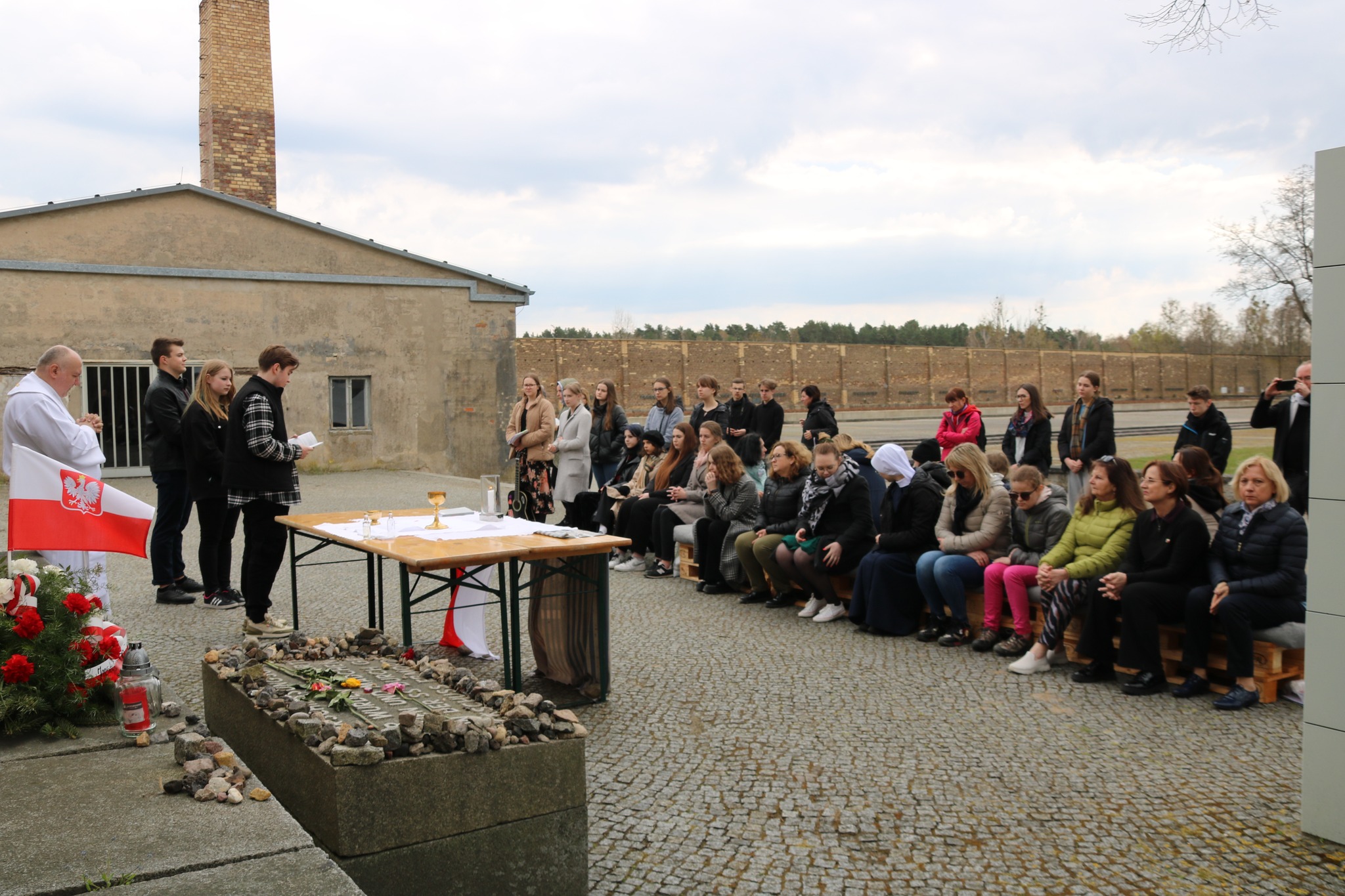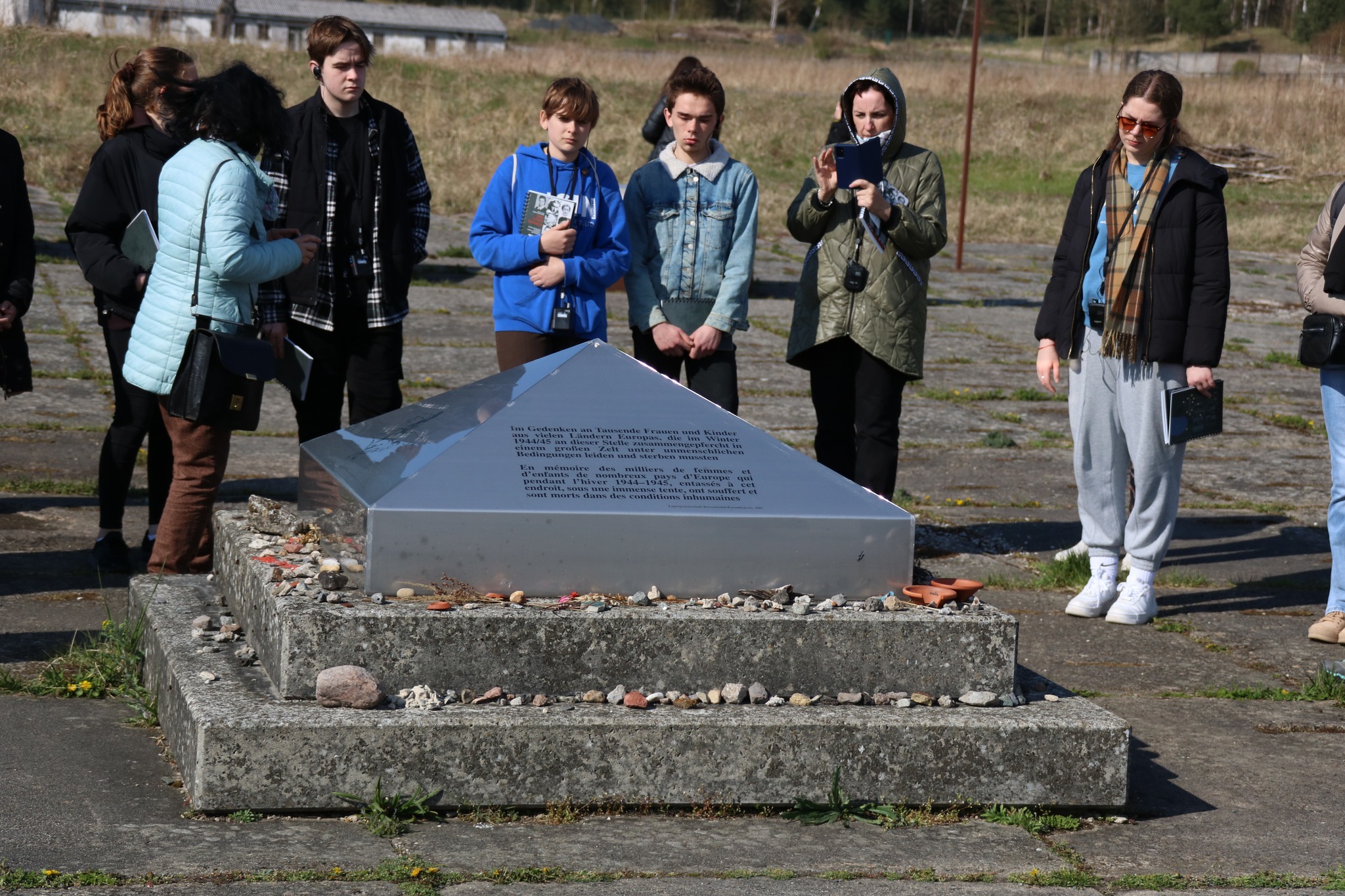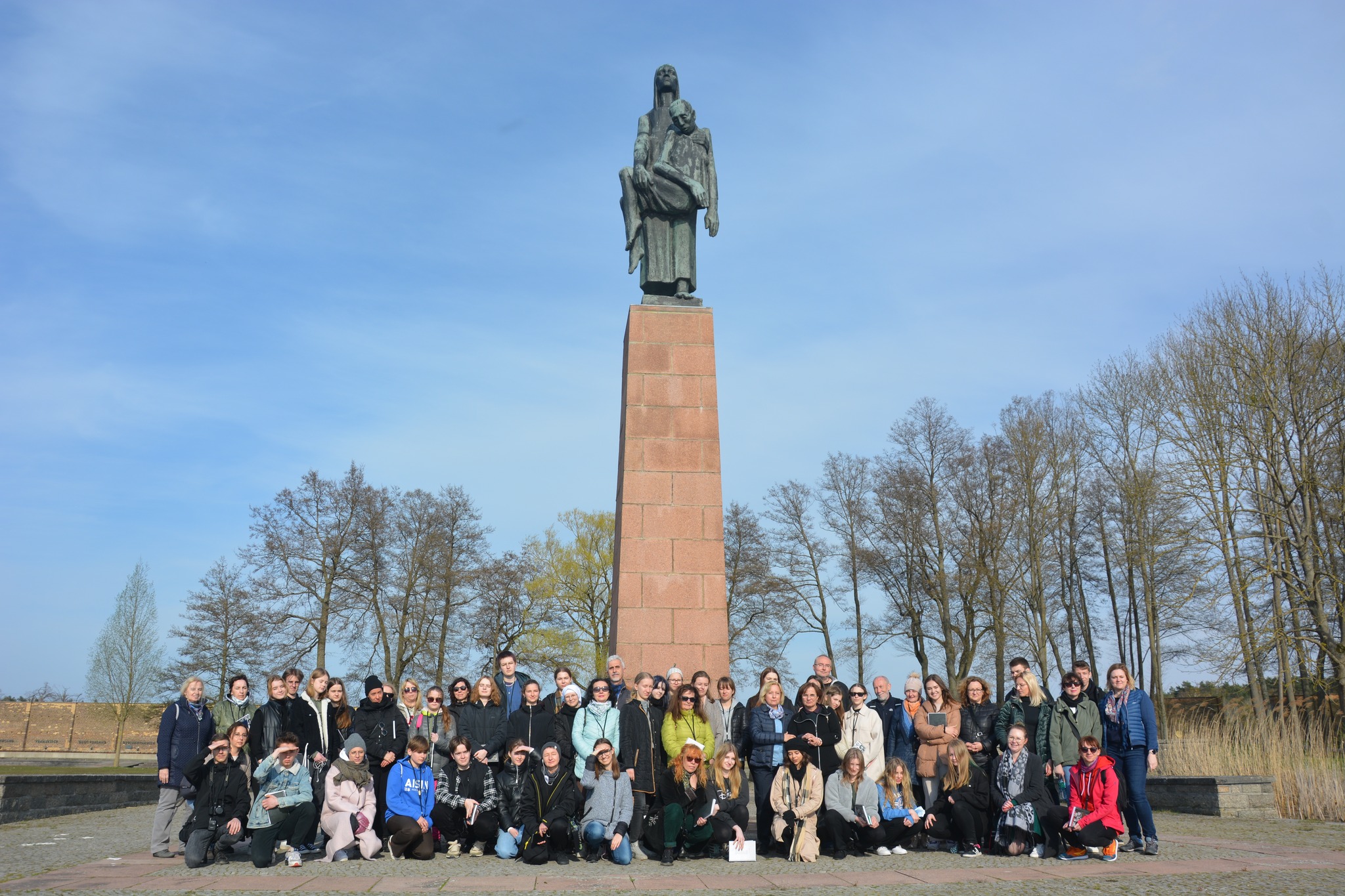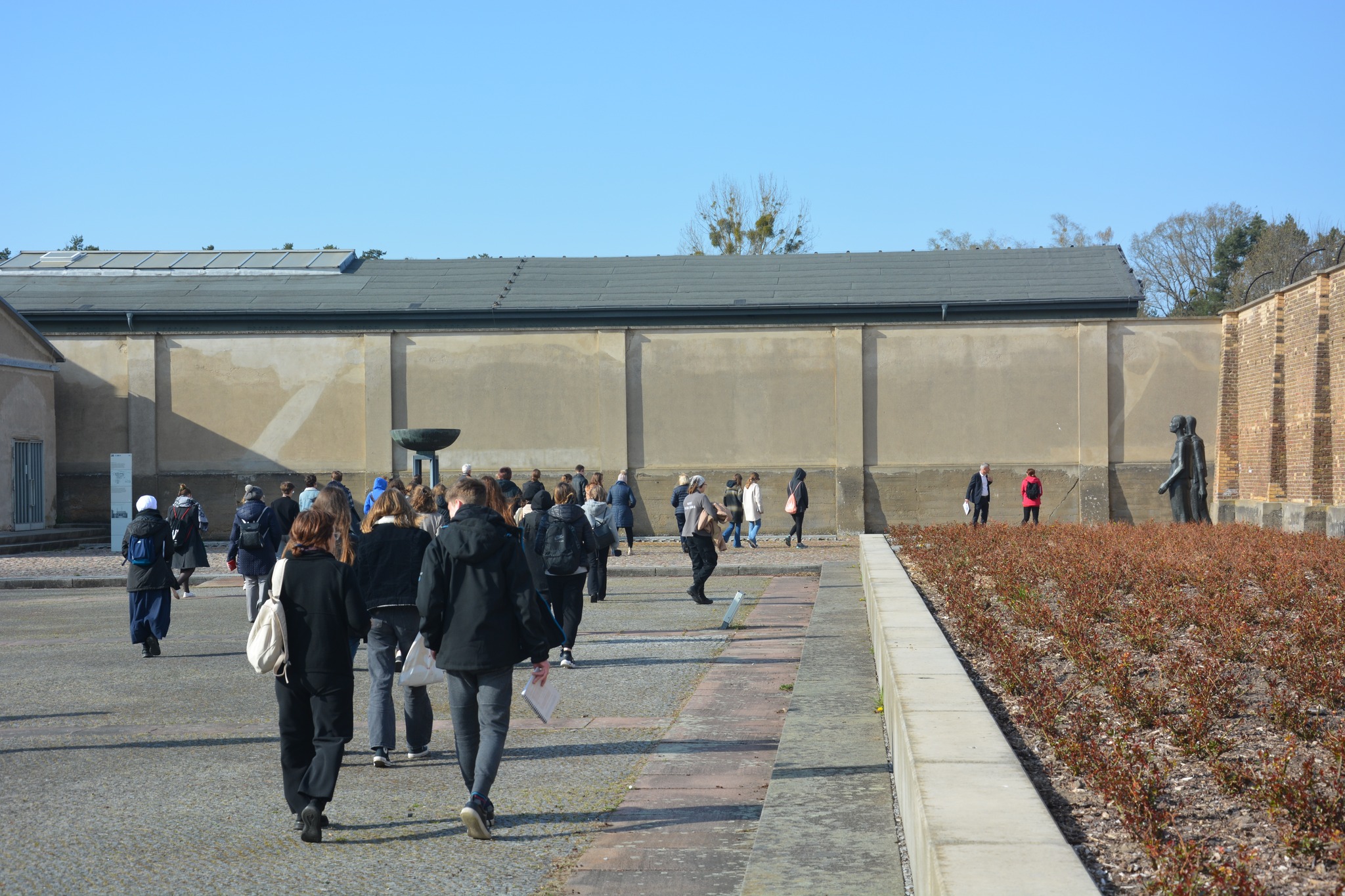 Idąc wzdłuż Ściany Narodów, minęliśmy zbiorową mogiłę, w której znajdują się szczątki więźniów. Upamiętnia ich specjalna odmiana róży: Ravensbrücka Róża Zmartwychwstania. Następnie udaliśmy się w kierunku budynku krematorium. Tu na własne oczy zobaczyliśmy machinę śmierci i unicestwienia. Na koniec przeszliśmy nad jezioro, pod pomnik Niosącej gdzie zapaliliśmy znicz i zrobiliśmy pamiątkowe zdjęcie.