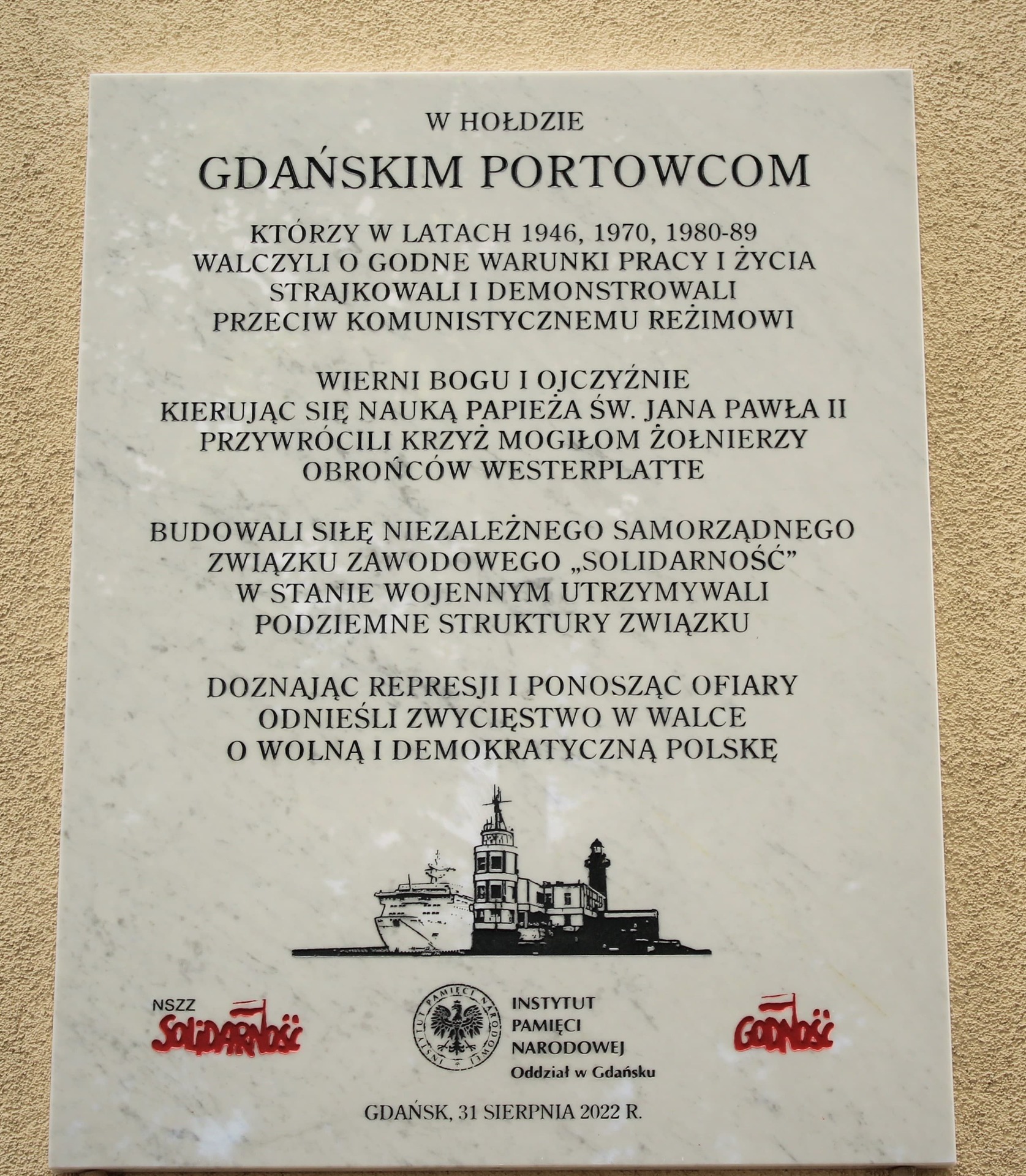 Tablica upamiętnia walkę o godność, patriotyzm, wiarę i zaangażowanie gdańskich portowców w walkę z komunistycznym reżimem w latach 1946, 1970, 1980–1989. Podane daty odnoszą się do historycznych momentów, ważnych w dziejach regionu i Polski. Strajk dokerów w Nowym Porcie, który miał miejsce w sierpniu 1946 roku, był jednym z pierwszych protestów przeciwko władzy komunistycznej na Wybrzeżu. Strajk, który początkowo miał podłoże ekonomiczne i dotyczył godnych warunków płacy i pracy, przerodził się w protest o hasłach wymierzonych w reżim komunistyczny. Robotniczy bunt został spacyfikowany siłą, a jego uczestnicy zostali surowo osądzeni. Ówczesne władze zastosowały też zasadę odpowiedzialności zbiorowej wobec mieszkańców dzielnicy, których wielu wysiedlono z Wybrzeża.