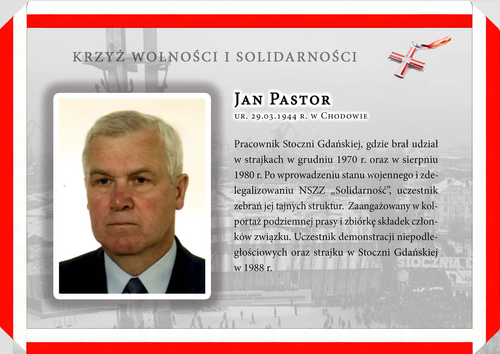 Krzyże Wolności i Solidarności przyznał Prezydent RP Andrzej Duda w uznaniu szczególnych zasług w działalności na rzecz odzyskania przez Polskę niepodległości i suwerenności lub respektowanie praw człowieka w Polskiej Rzeczypospolitej Ludowej. Uroczystość odbyła się w historycznej Sali BHP w Gdańsku.