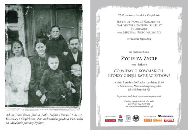W 65. rocznicę powołania Rady Pomocy Żydom i zbrodni w Ciepielowie Instytut Pamięci Narodowej, Narodowe Centrum Kultury i Picaresque przygotowały premierę filmu „Życie za życie” oraz na debatę „Co wiemy o Kowalskich, którzy ginęli ratując Żydów?” 5 grudnia o godz. 12.00 do Muzeum Niepodległości przy Al. Solidarności 62.
