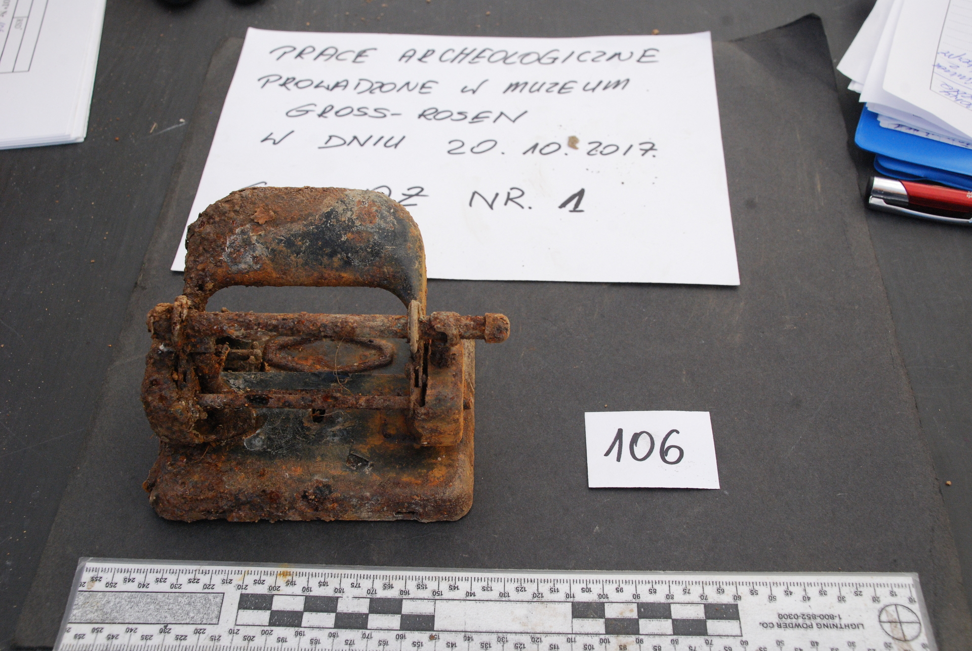 Wśród artefaktów były też przybory biurowe, przykładowo dziurkacze do papieru, kałamarze oraz przedmioty pochodzące z kantyny dla załogi obozu jak łyżki, widelce i noże stołowe, opakowania szklane po piwie z nazwą niemieckiego producenta z lat 40-tych ub. wieku, a także inne przedmioty, jak elementy urządzeń elektrycznych, szpadel, kilof, młotek, szufle, kombinerki.
