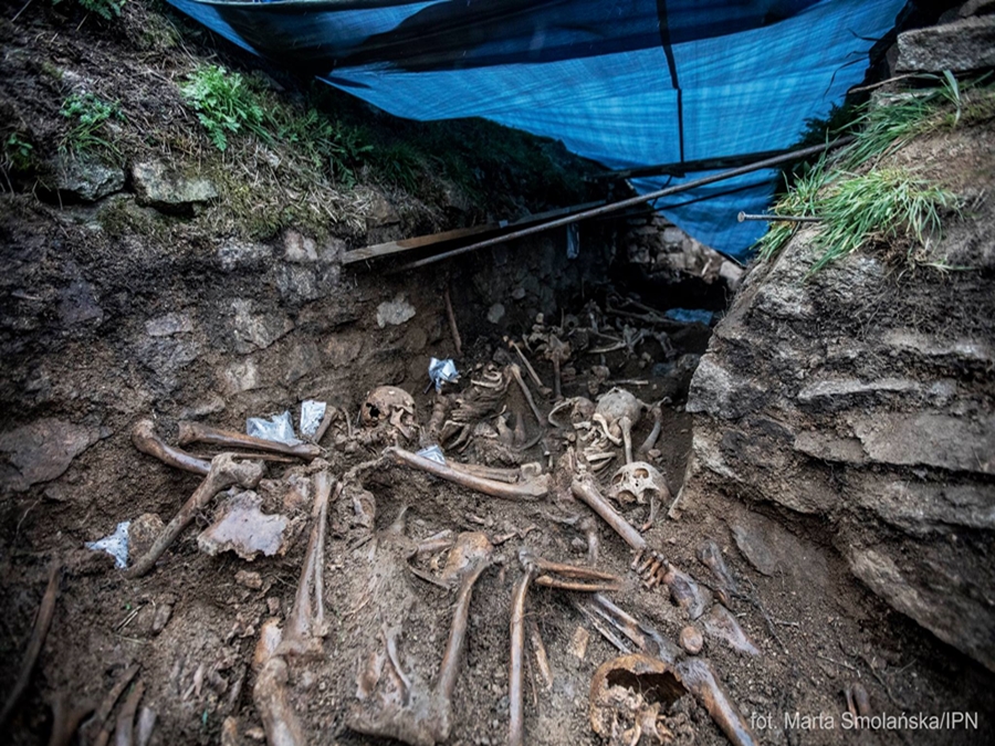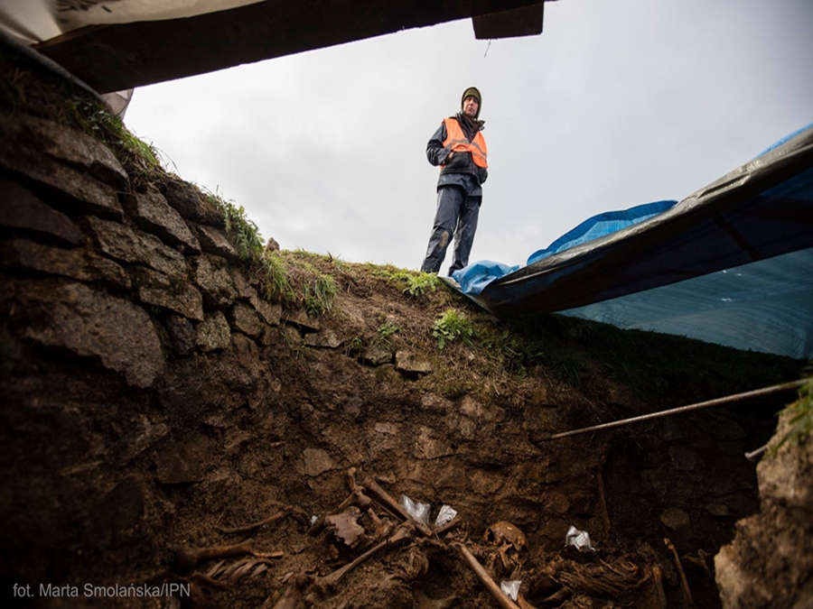– Szczelina przeciwlotnicza: długa na 60 metrów, szeroka na 2 metry, a głęboka na metr siedemdziesiąt. Do tej szczeliny wrzucono szczątki – ciała 92 mężczyzn w wieku od 20 do 60 lat. I to nie tylko ciała mężczyzn, którzy już nie żyli, ale także osoby wciąż żyjące. Wciąż żyjące i wciąż oczekujące na to, że przyjdzie ostateczna pomoc, która nie przyszła. 92 ciała wrzucone jak śmieci, przykryte gruzem i zasypane ziemią. Były w tej ziemi przez blisko 80 lat. Ludzie, ich emocje, ich miłość, ich dramaty, każdy z tych 92 mężczyzn miał swoje życie, które zostało na blisko 80 lat zapomniane i zasypane, jak ludzki śmieć – przypomniał podczas konferencji prasowej prezes IPN dr Karol Nawrocki.