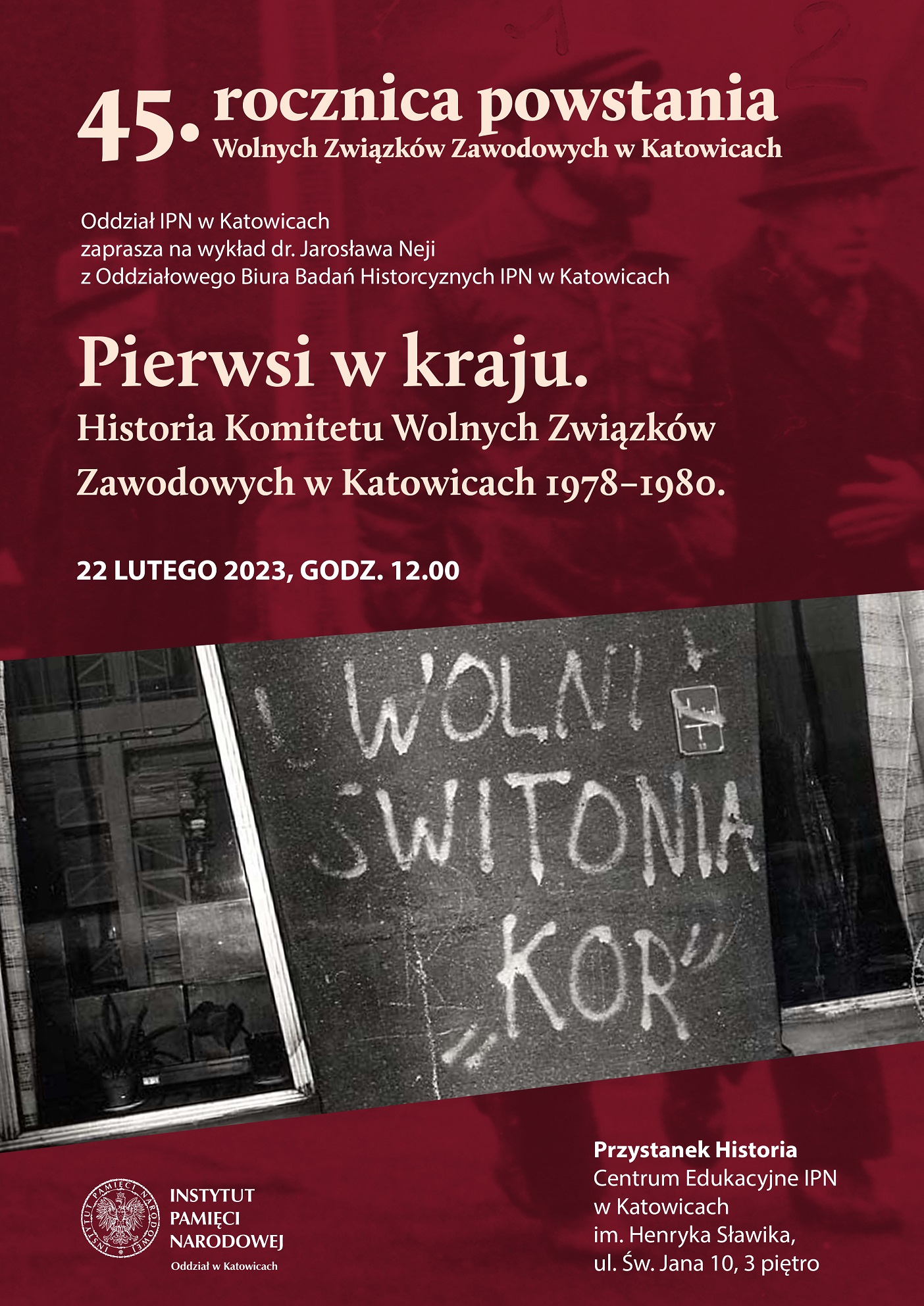 • 22 lutego 2023 r. w Przystanku Historia – Centrum Edukacyjnym IPN w Katowicach im. Henryka Sławika, ul. św. Jana 10 (3 piętro) odbył się wykład popularnonaukowy dr. Jarosława Nei (OBBH Katowice) „Pierwsi w kraju. Historia Komitetu wolnych Związków Zawodowych w Katowicach 1978–1980”. Po wykładzie pokaz filmu „Bezpieka kontra śląskie WZZ”.