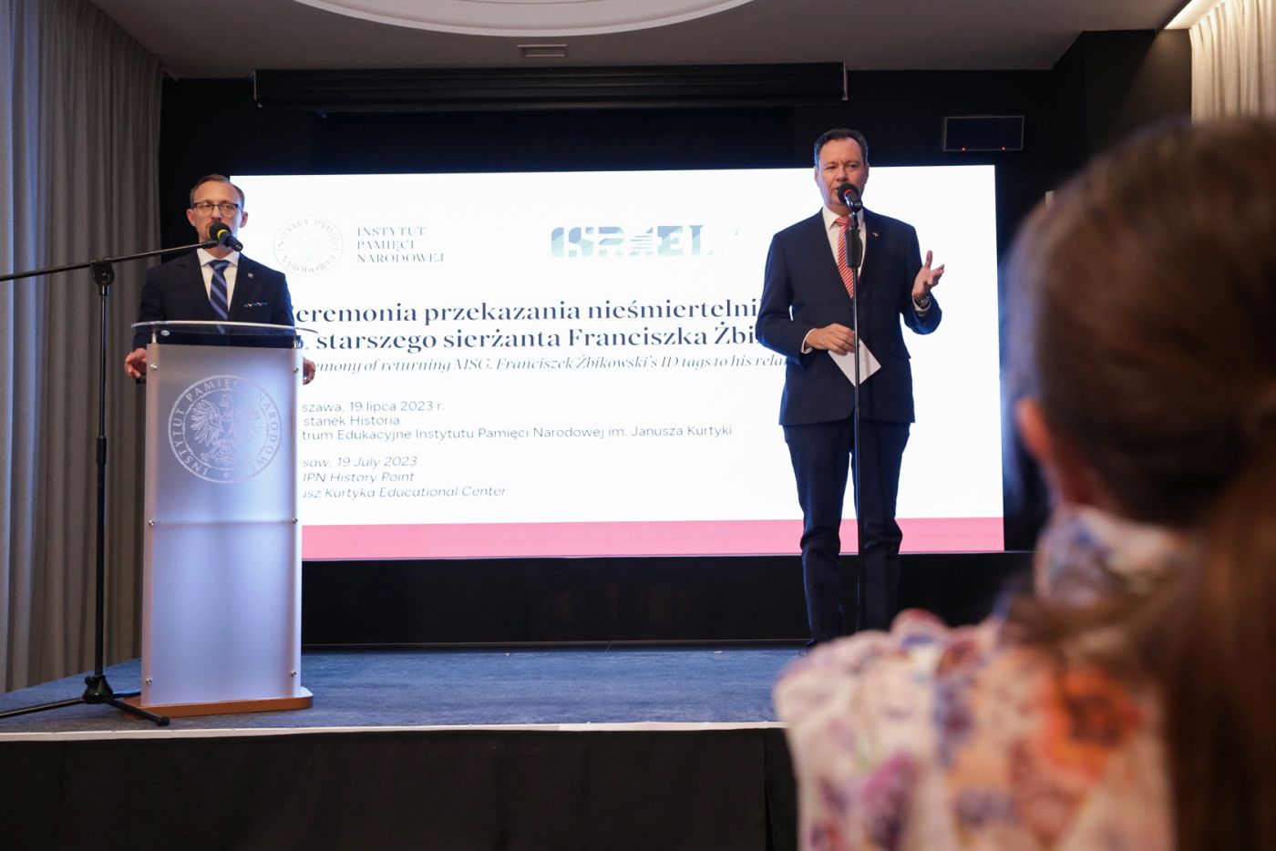 Uroczyste przekazanie nieśmiertelnika należącego do Franciszka Żbikowskiego jego bliskim – Warszawa, 19 lipca 2023. Fot. Mikołaj Bujak (IPN)