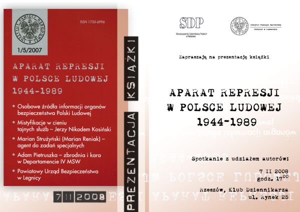 Instytut Pamięci Narodowej Oddział w Rzeszowie oraz Stowarzyszenie Dziennikarzy Polskich w Rzeszowie przygotowały prezentację V tomu wydawanego w Rzeszowie ogólnopolskiego periodyku naukowego „Aparat Represji w Polsce Ludowej 1944–1989”. Głównym celem wydawnictwa, które ukazuje się od 2004 roku, jest pogłębienie, skoordynowanie oraz upowszechnienie prac badawczych dotyczących aparatu represji w PRL. Prezentacja odbyła się 7 lutego 2008 r. w Klubie Dziennikarza w Rzeszowie, ul. Rynek 25.
