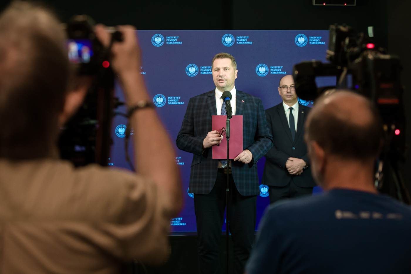 Minister Przemysław Czarnek podczas konferencji prasowej dotyczącej konkursu dla nauczycieli najlepszy scenariusz lekcji „Sprawiedliwi z Markowej” – Warszawa, 8 września 2023. Fot. Sławek Kasper (IPN)