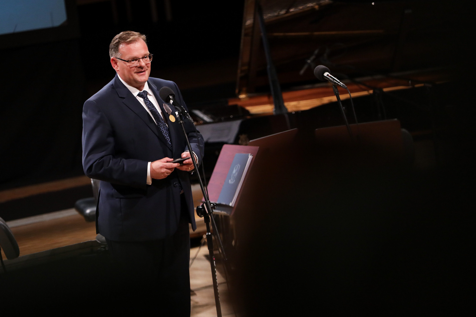 Wręczenie medalu Reipublicae Memoriae Meritum oraz koncert „…w drodze” w ramach cyklu „Artyści Andersa”. Na zdj. dr Karol Nawrocki, prezes IPN – Warszawa, 20 września 2023. Fot. Mikołaj Bujak (IPN)