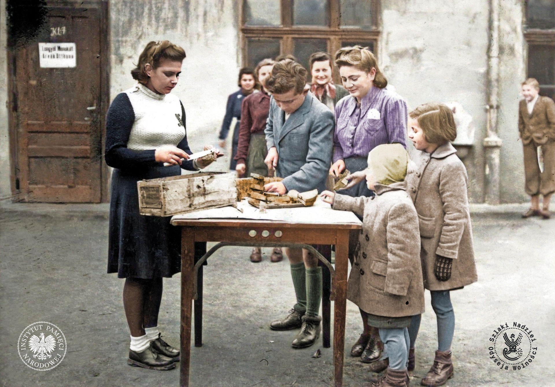 Tova Steiner (obecnie Feldman) smaruje chleb marmoladą, przysłaną przez Henryka Sławika. Sierociniec dzieci żydowskich w Vácu, oficjalnie funkcjonował jako „Sierociniec Dzieci Polskich Oficerów”. Budynek znajdował się – symbolicznie – między kościółkiem, a synagogą. Vac, 1943 r. (fot. ze zbiorów Grzegorza Łubczyka)