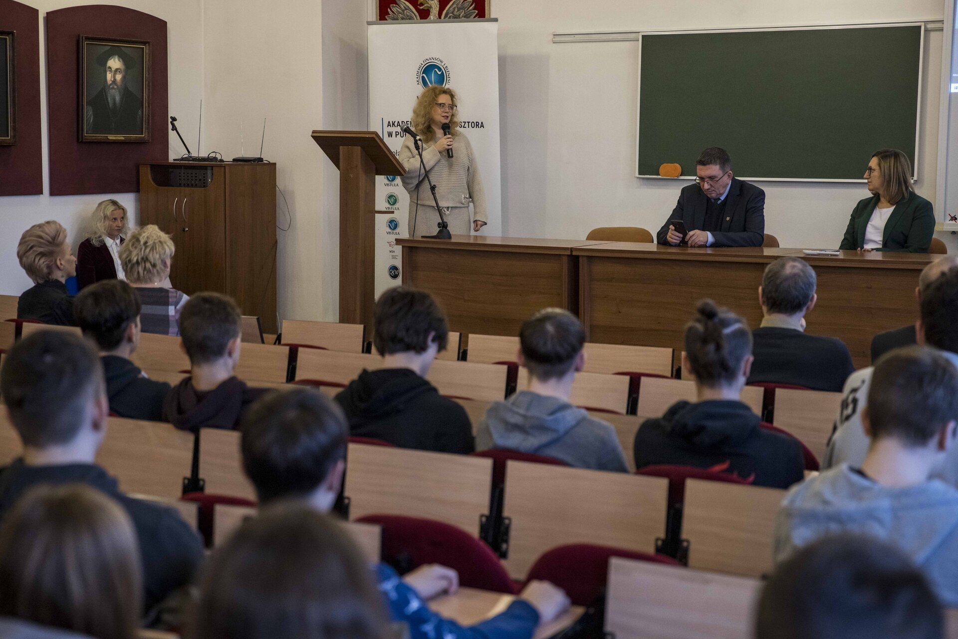 Zebranych gości i młodzież z Zespołu Szkół Zawodowych im. Jana Ruszkowskiego w Pułtusku z dyrektor szkoły, p. Anną Kmiołek-Gizarą, powitała dr Marta Milewska, kierownik Izby Pamięci Strzelecka 8, a jednocześnie dyrektor Programu Kształcenia na kierunku Historia w Akademii Finansów i Biznesu Vistula.