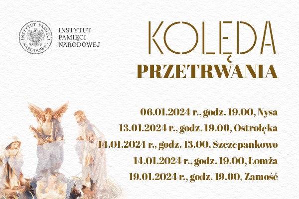 Instytut Pamięci Narodowej zaprasza na wyjątkowe koncerty „Kolęda przetrwania”, podczas których obok popularnych kolęd i pastorałek wykonane zostaną również kolędy obozowe i okupacyjne (np. Kolęda Katyńska czy Kolęda warszawskich powstańców do kompozycji Krzysztofa Falkowskiego). Czas Bożego Narodzenia to bowiem nie tylko chwile pełne radosnego świętowania i obecności bliskich, ale również okres zadumy, tęsknoty i wspomnień tych, których zabrakło przy świątecznym stole.