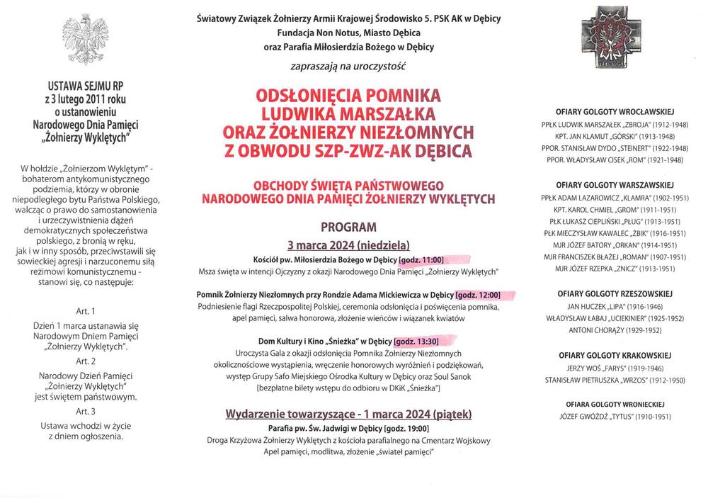 3 marca 2024 r. w Dębicy odbędzie się odsłonięcie pomnika Ludwika Marszałka oraz Żołnierzy Niezłomnych z obwodu SZP-ZWZ-AK Dębica.