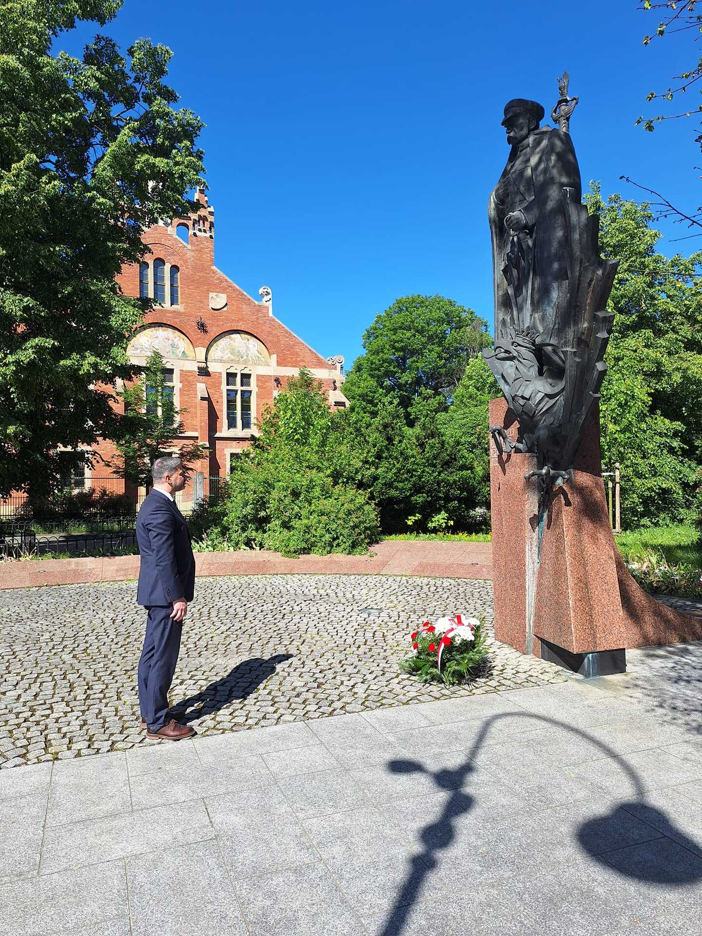 Józefa Piłsudskiego upamiętniliśmy również 12 maja 2024 roku, składając kwiaty przy pomniku Marszałka Józefa Piłsudskiego w Alejach Ujazdowskich przy Belwederze.