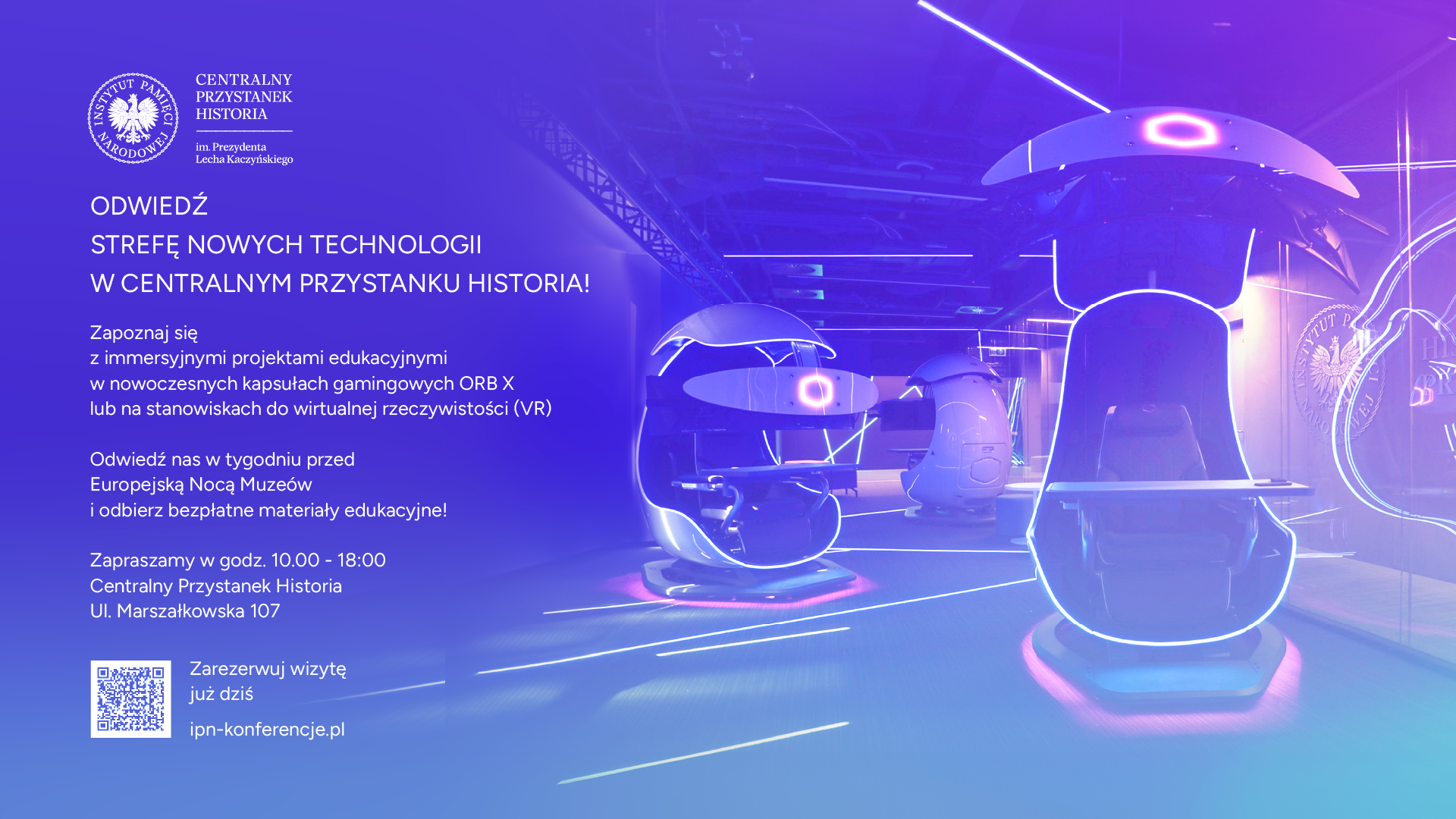Z okazji Europejskiej Nocy Muzeów zapraszamy przez cały tydzień – 13–18 maja 2024 r. – do Strefy Nowych Technologii Centralnego Przystanku Historia przy ulicy Marszałkowskiej 107 w Warszawie.