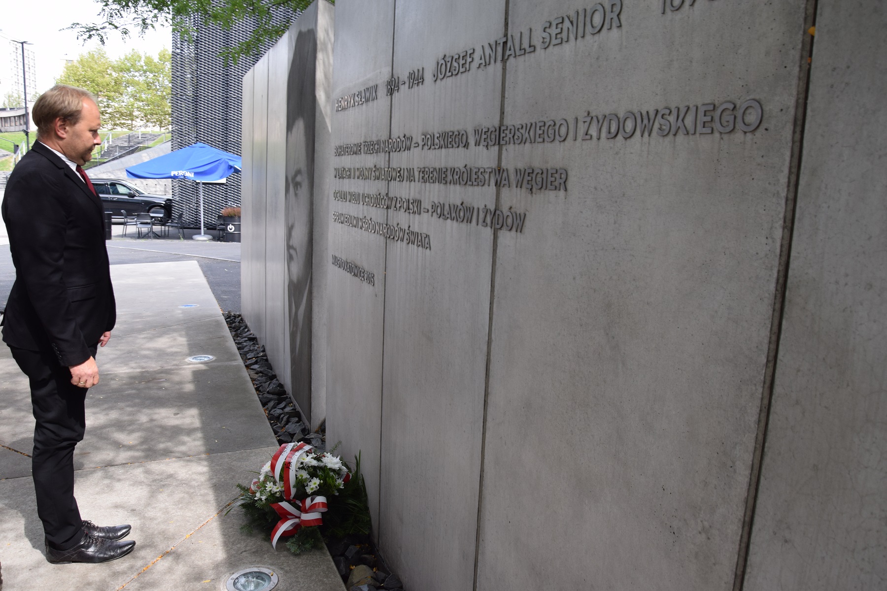 Jan Kwaśniewicz, naczelnik Oddziałowego Biura Upamiętniania Walk i Męczeństwa w Katowicach złożył kwiaty przed katowickim pomnikiem Sławika oraz jego węgierskiego współpracownika Józsefa Antalla. Fot. Dominik Grabis/IPN