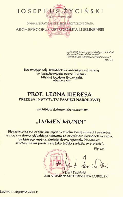 W auli seminarium duchownego prof. Leon Kieres wygłosił wykład o kwestiach żydowskich w pracach Instytutu Pamięci Narodowej. Podczas spotkania metropolita lubelski abp Józef Życiński wręczył profesorowi medal "Lumen Mundi". Wyraził wdzięczność i solidarność za to, co robi szef IPN.. "Ludzie uczciwi czują się samotni. Ci, którzy kierują się głosem sumienia, są bici i z lewa, i z prawa. Chcę dziś wręczyć profesorowi Kieresowi ten medal, by czuł, że nie jest sam" - powiedział abp Życiński.
