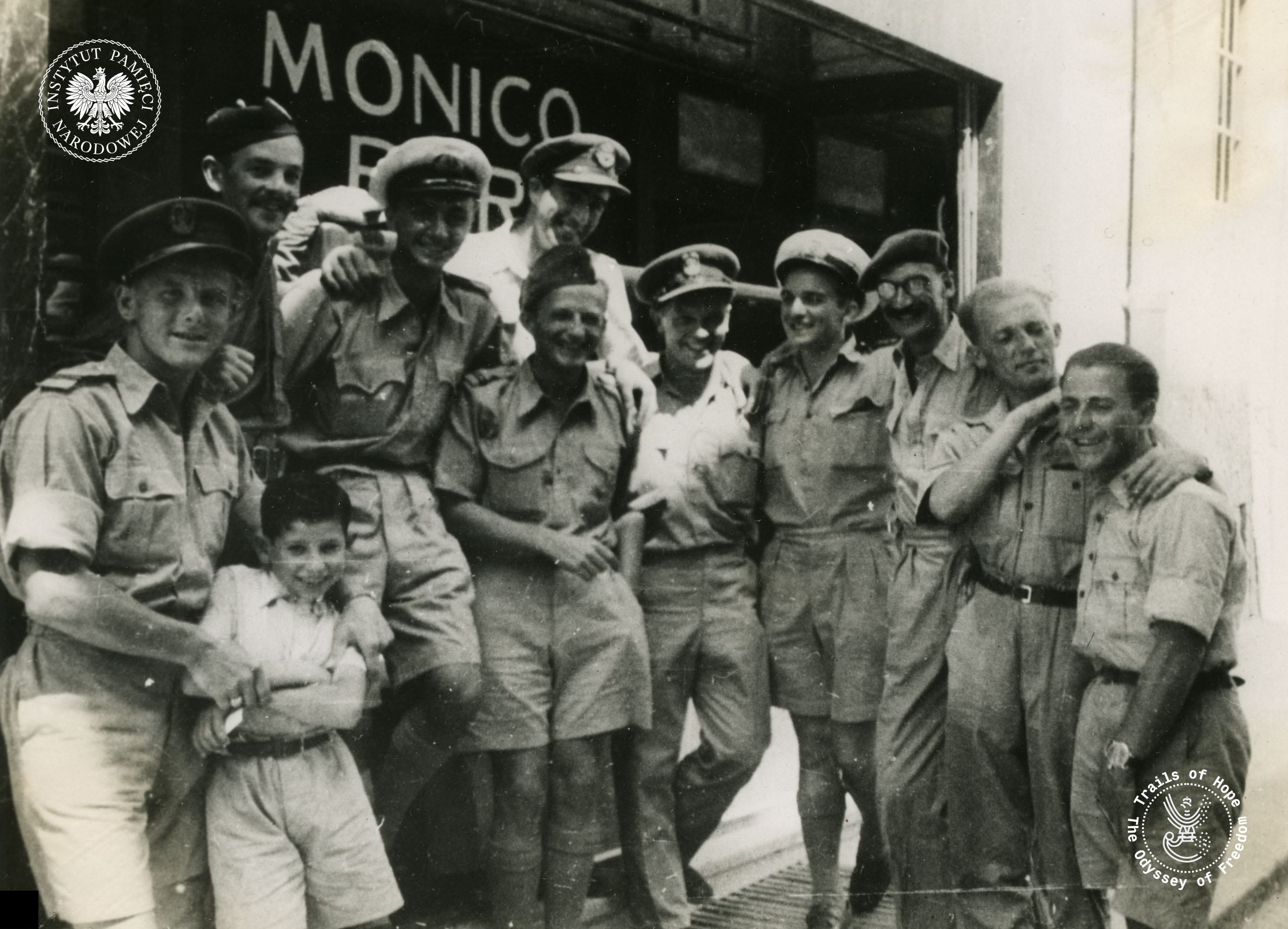Załoga polskiego okrętu podwodnego i lotnicy z „cyrku Skalskiego”. Od prawej: Marcin Machowiak i Kazimierz Sztramko, w środku w krótkich spodniach i furażerce Bohdan Arct, pierwszy z lewej Kazimierz Sporny, Malta, 1943 r. (fot. Instytut Polski i Muzeum im. gen. Sikorskiego w Londynie, zdjęcie udostępnione przez Fundację Ośrodka KARTA)