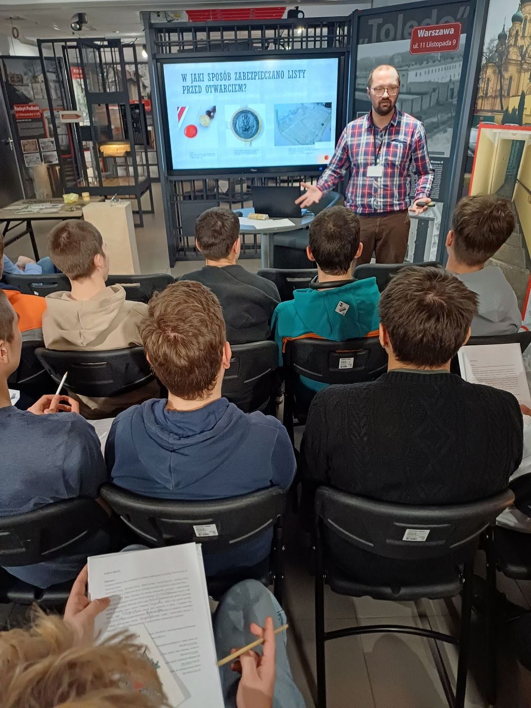 Następnie goszczący na wernisażu uczniowie Zespołu Szkół nr 40 im. Stefana Starzyńskiego wzięli udział w przygotowanej przez Rafała Borkowskiego (OBBH w Warszawie) lekcji pt. Historia listu. Od czasów najdawniejszych do współczesności.