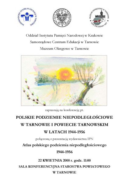 Oddział Instytutu Pamięci Narodowej w Krakowie, Samorządowe Centrum Edukacji w Tarnowie oraz Muzeum Okręgowe w Tarnowie przygotowały konferencję „Polskie podziemie niepodległościowe w Tarnowie i powiecie tarnowskim w latach 1944–1956”, połączoną z prezentacją wydawnictwa IPN „Atlas polskiego podziemia niepodległościowego 1944–1956”.