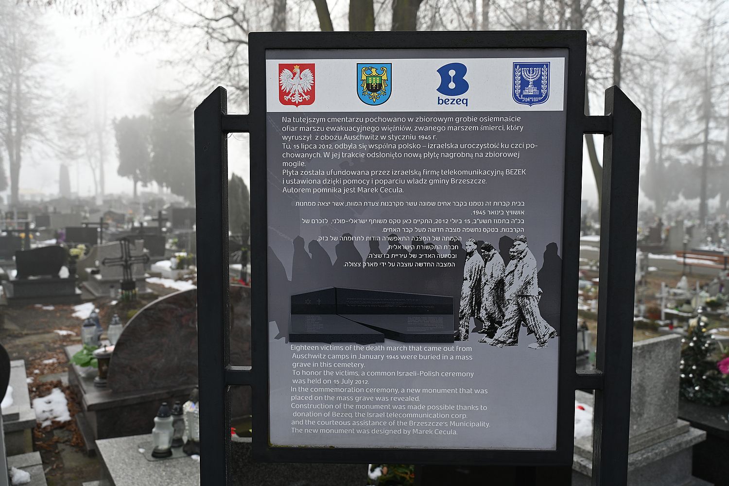 W dniach 17-21 stycznia 1945 r. główną drogą przez Brzeszcze przeszło ok. 25 tys. więźniów. W kolumnie znajdowali się również więźniowie z podobozów KL Auschwitz-Bor/Budy i KL Auschwitz-Jawischowitz. Wiele osób nie wytrzymało już pierwszych dni morderczej wędrówki. Zmarli z wycieńczenia albo od kul esesmanów. Niemiecki burmistrz Brzeszcz nakazał mieszkańcom pochowanie zwłok więźniów. Do zbiorowej mogiły złożono 18 ciał kobiet i mężczyzn.