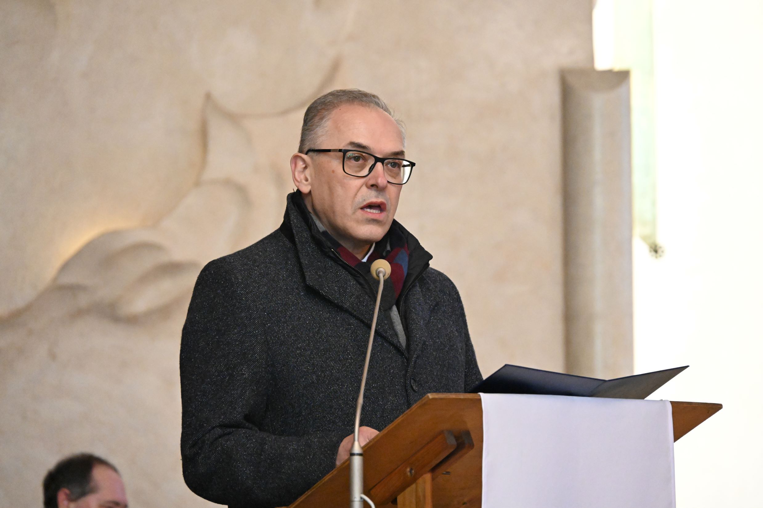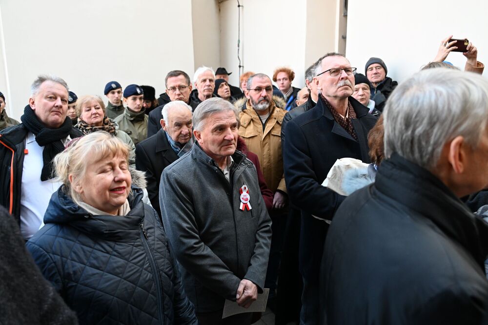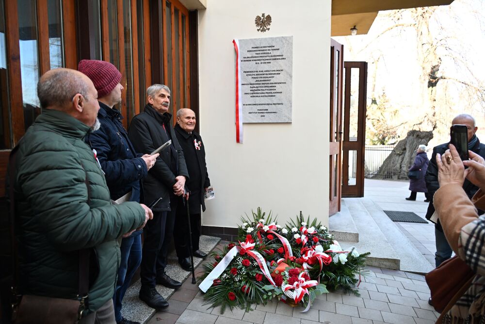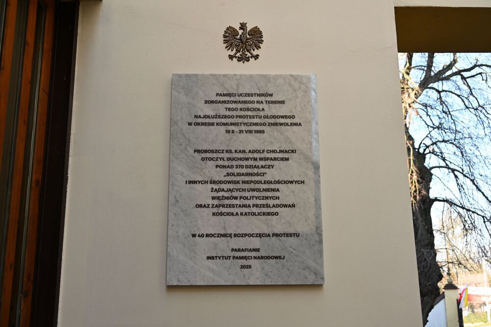 Następnie uczestnicy przeszli przed wejście do kościoła, gdzie abp Marek Jędraszewski poświęcił tablicę. Odsłonięcia upamiętnienia umieszczonego na elewacji świątyni dokonali reprezentujący uczestników głodówki Anna Pietras i Kazimierz Pająk oraz dr hab. Filip Musiał.