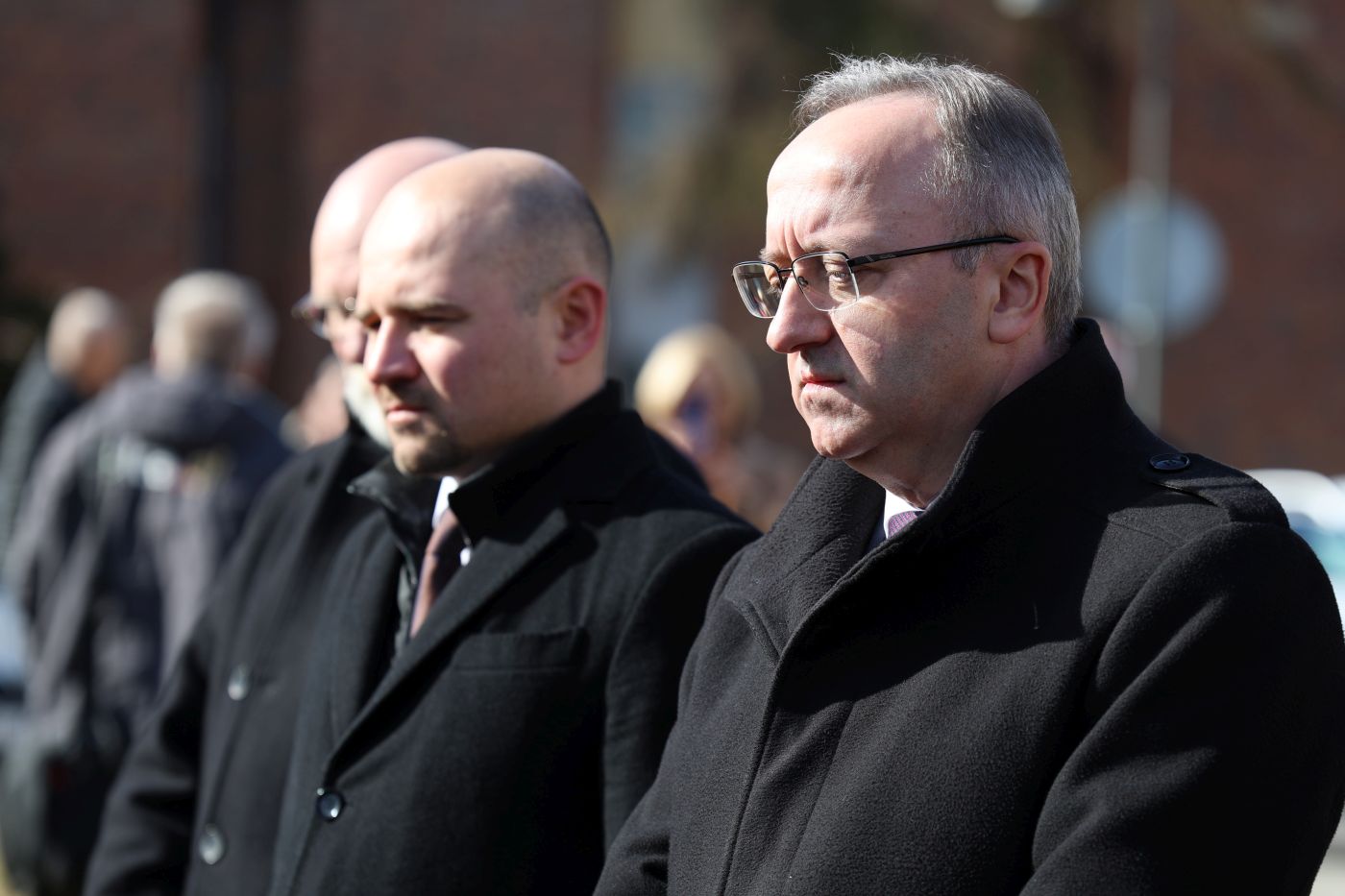 Przedstawiciele IPN złożyli kwiaty pod pomnikiem Pamięci Ofiar Lubina '82. Na zdj. od lewej: dr hab. Kamil Dworaczek, dyrektor wrocławskiego IPN, dr hab. Karol Polejowski, zastępca prezesa IPN (C), Andrzej Pozorski, szef pionu śledczego IPN (L) – Lubin, 4 marca 2025. Fot. Maciej Parysek (IPN)