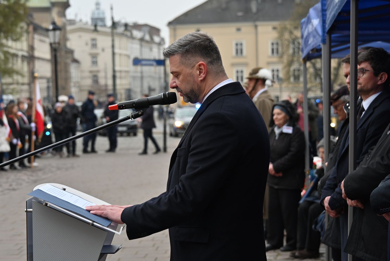 – Składamy hołd ponad 22 tysiącom polskich oficerów, przedstawicieli służb mundurowych, zamordowanych przez Sowietów w czasie ludobójstwa katyńskiego. Odwołujemy się do tego, jako do zbrodni wojennej, która została dokonana na jeńcach, wbrew wszelkim umowom międzynarodowym. Ale nie możemy zapominać, że mówimy o wymordowanej elicie. O ludziach, którzy w znaczącej większości byli oficerami i podoficerami rezerwy, a więc w cywilu byli nauczycielami, lekarzami, naukowcami. Byli państwowotwórczą elitą, budującą niepodległą II Rzeczpospolitą – powiedział w swoim wystąpieniu dyrektor Oddziału IPN w Krakowie dr hab. Filip Musiał.
