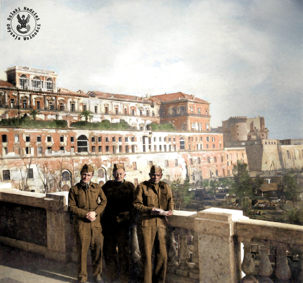 Żołnierze 3. Dywizji Strzelców Karpackich na tle Pałacu Królewskiego w Neapolu w 1944 r., fot. AIPN