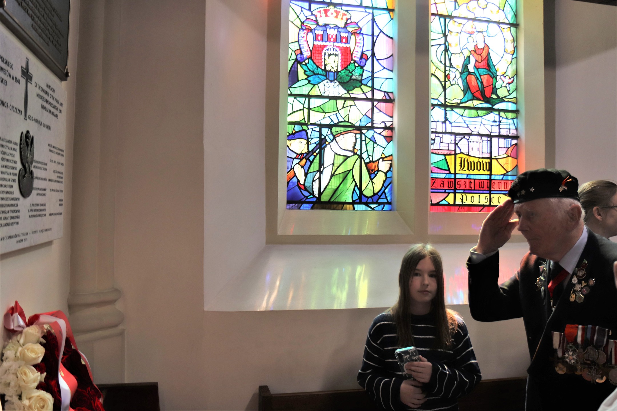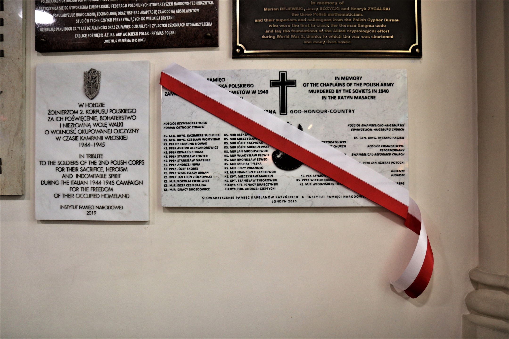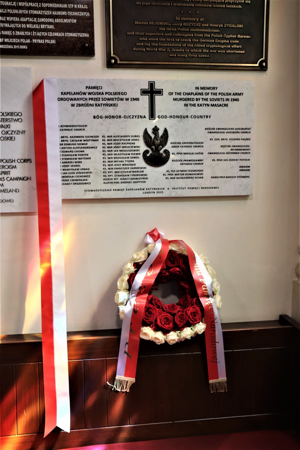 Podczas mszy została odsłonięta i poświęcona tablica upamiętniająca kapelanów wojskowych – ofiary Zbrodni Katyńskiej. Inicjatorem powstania tablicy jest Stowarzyszenie Pamięć Kapelanów Katyńskich, a jej fundatorem Biuro Upamiętniania Walk i Męczeństwa Instytutu Pamięci Narodowej. Ceremonii odsłonięcia upamiętnienia dokonali Piotr Wilczek ambasador RP w Wielkiej Brytanii i Irlandii Północnej, Adam Siwek dyrektor Biura Upamiętniania Walk i Męczeństwa IPN oraz Łukasz Stefaniak prezes Stowarzyszenia Pamięć Kapelanów Katyńskich. Modlitwę błogosławieństwa odmówił i tablicę poświęcił ks. bp Wiesław Lechowicz.