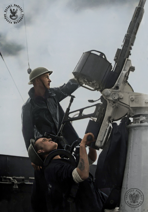 ORP „Ślązak”, marynarze celują z działa przeciwlotniczego, lipiec 1944 r. Fot. ze zbiorów AIPN -