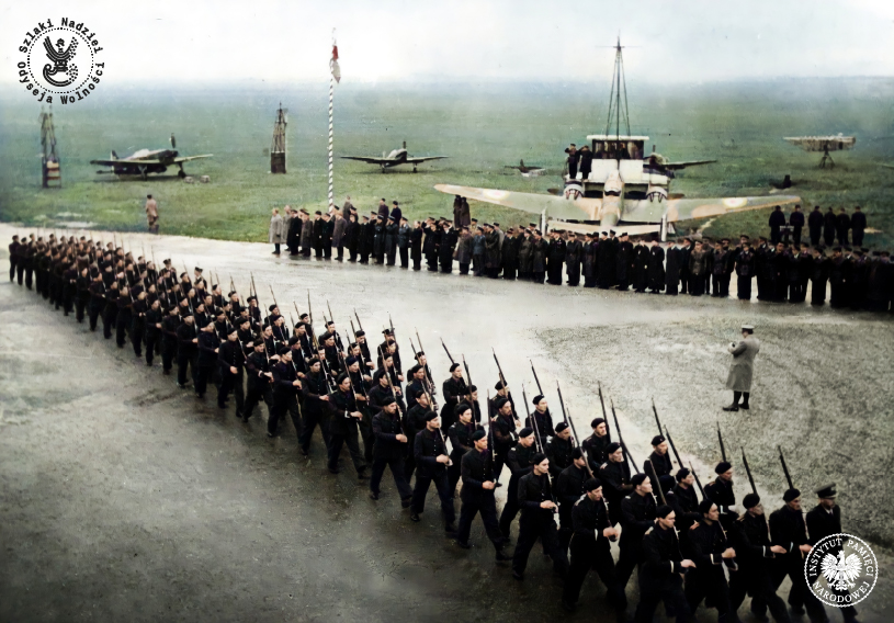 Defilada pododdziału w trakcie uroczystości w jednostce lotniczej Wojska Polskiego we Francji z okazji pożegnania pilotów Eskadry Myśliwskiej Montpellier na lotnisku Lyon-Bron, 27 marca 1940 r. Fot. ze zbiorów AIPN -