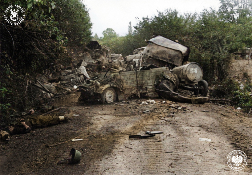 Na drodze w korytarzu śmierci po bitwie pod Falaise, Francja, 1944 r. Fot. ze zbiorów AIPN -