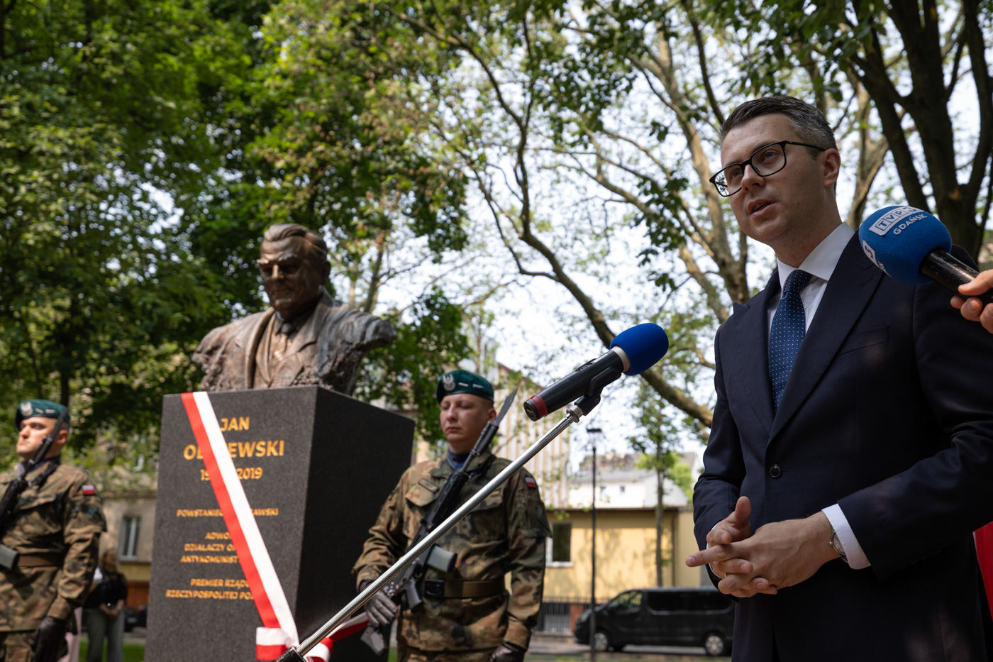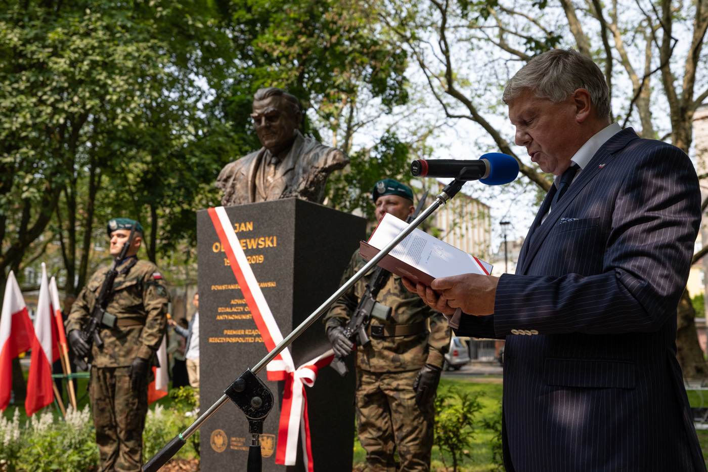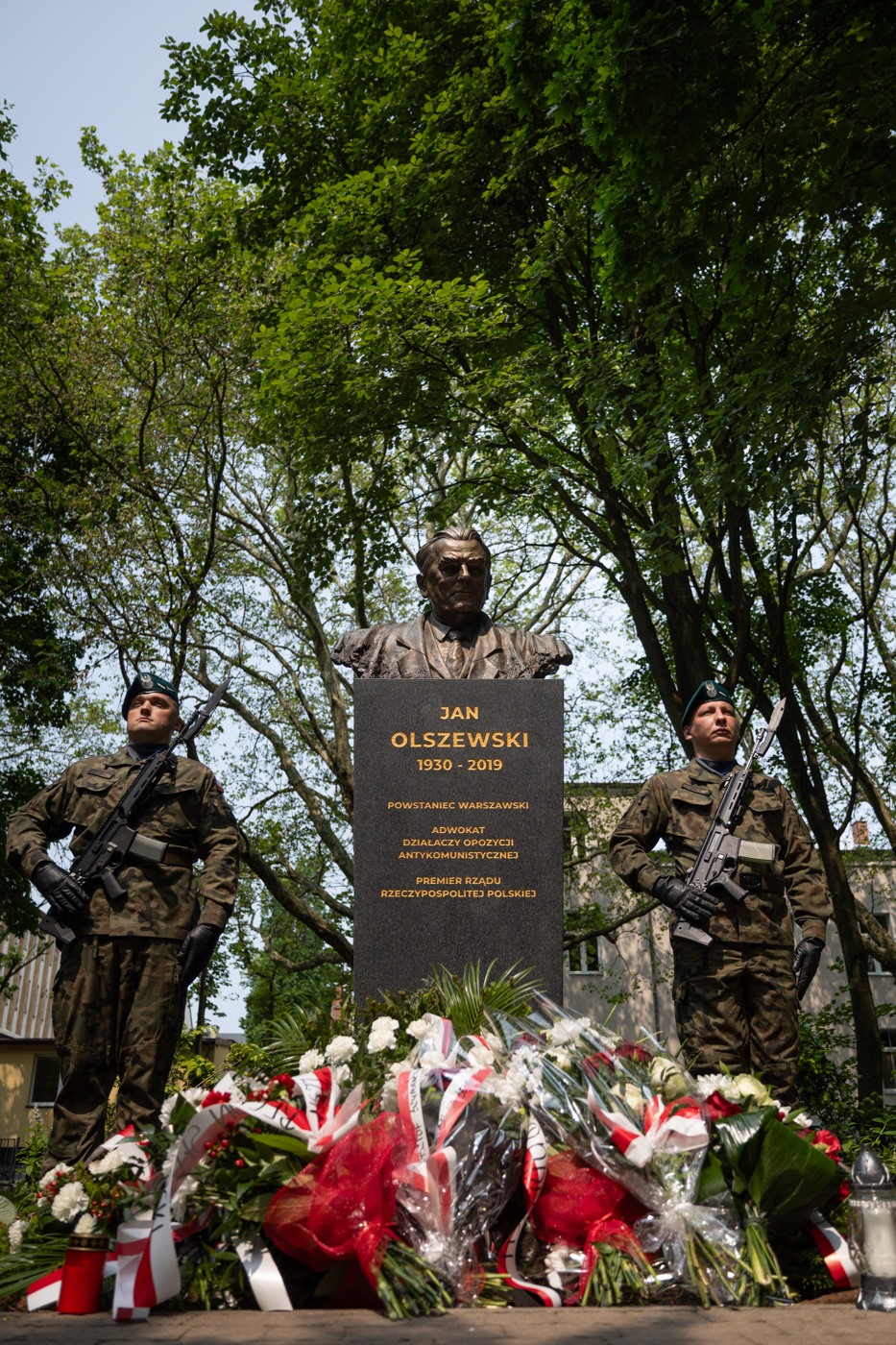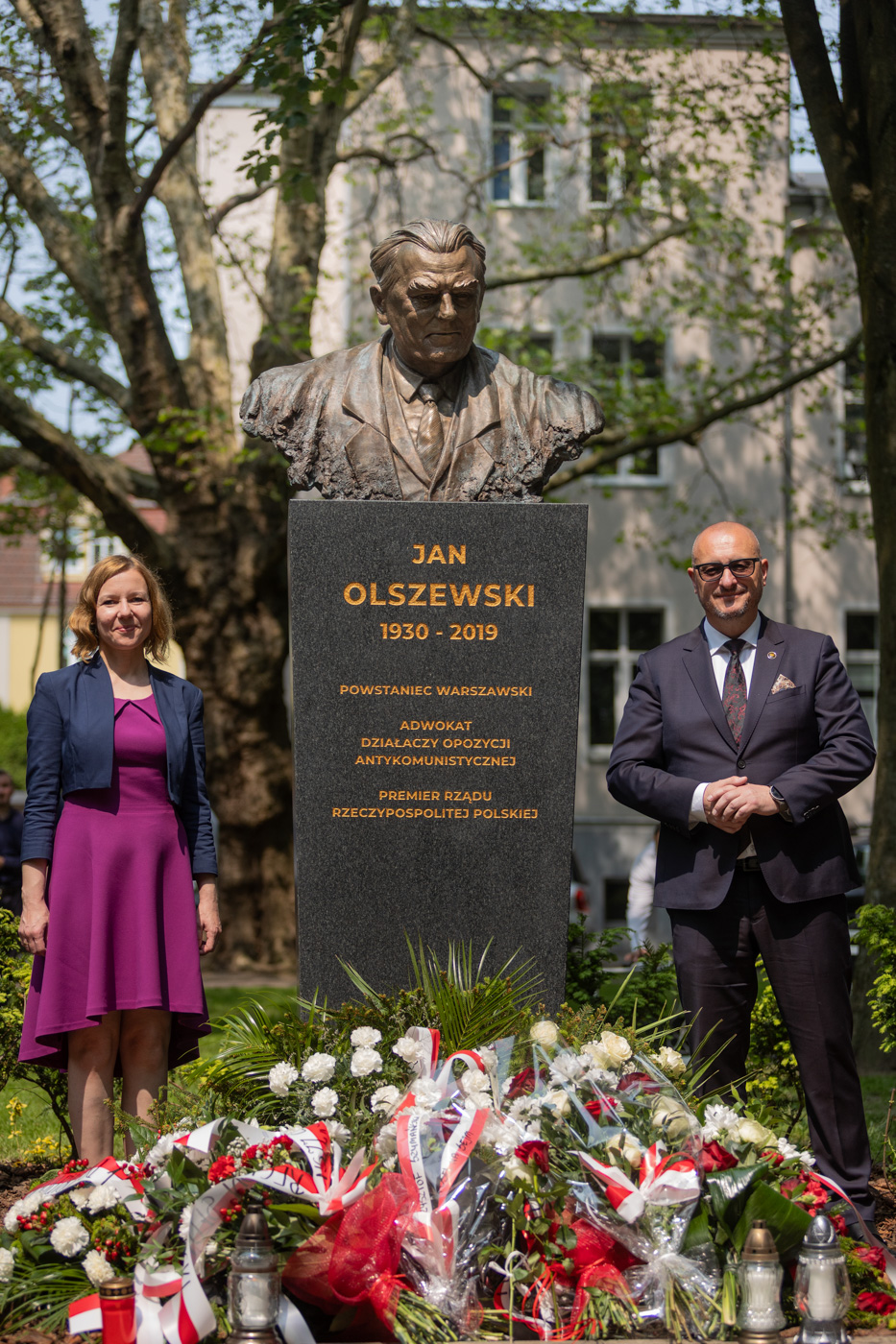 Wśród przemawiających znaleźli się również Piotr Karczewski, Doradca Prezydenta RP, Piotr Muller, Poseł do Parlamentu Europejskiego oraz Krystyna Danilecka-Wojewódzka, Prezydentka Miasta Słupska. Odsłonięcia pomnika dokonali wspólnie Waldemar Szulc, Europoseł Piotr Muller, Prezydentka Miasta Słupska Krystyna Danilecka-Wojewódzka oraz Tadeusz Bobrowski – inicjator wzniesienia upamiętnienia. Pomnik został poświęcony przez kapelana Garnizonu Słupsk, księdza kapitana Arnolda Kulińskiego. Po uroczystym złożeniu wieńców przez delegacje, wydarzenie zwieńczył występ artystyczny z repertuarem pieśni powstańczych. Budowę pomnika współfinansował Instytut Pamięci Narodowej. Uroczystość stanowiła ważny gest pamięci wobec postaci premiera Jana Olszewskiego oraz wartości, które reprezentował.